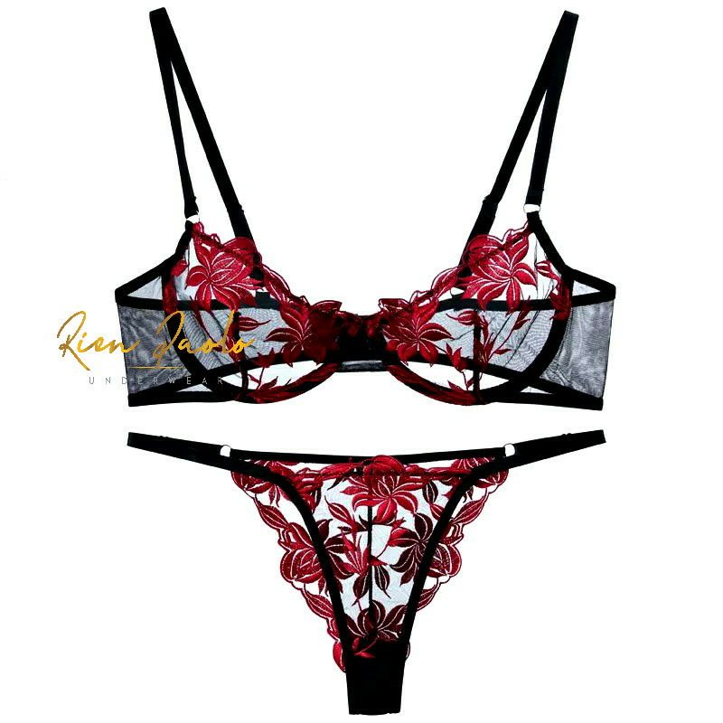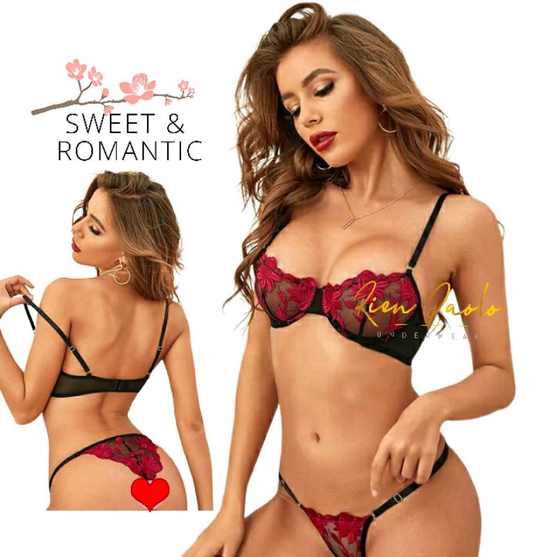 Bra Set BH CD G String Set Sexy Hot Lingerie Kawat Motif Bordir Bunga Transparan Renda Premium 365be