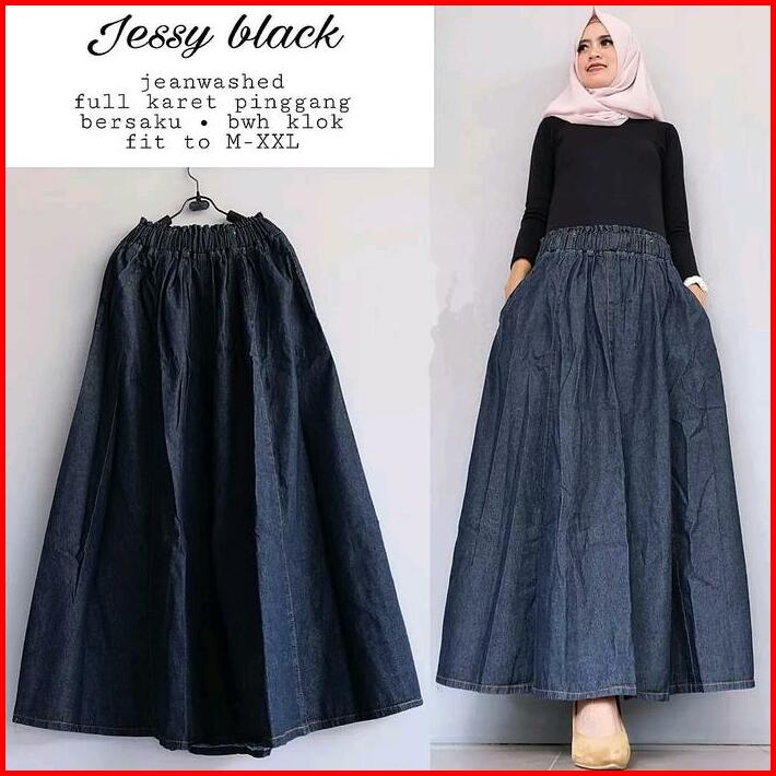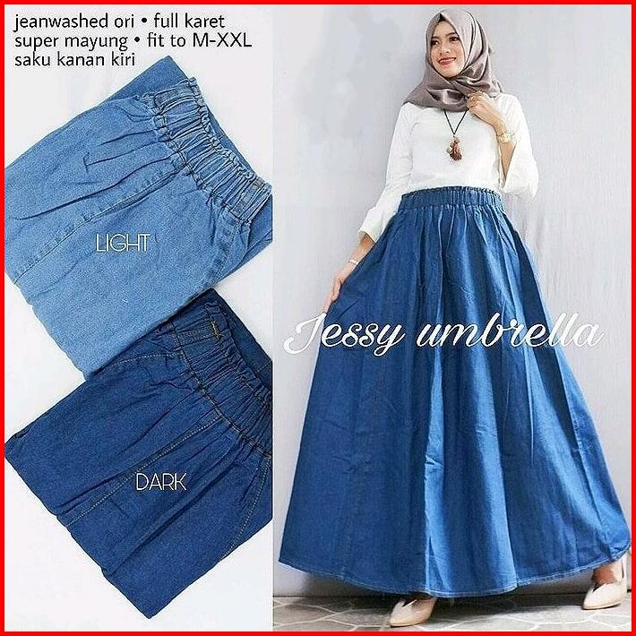 Jessy Rok Pecah Panjang Jeans Wanita Kekinian Pinggang Full Karet Rok Mayung Umbrella Skirt