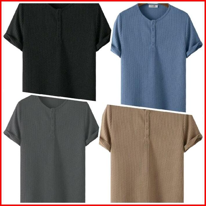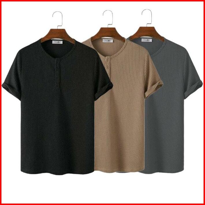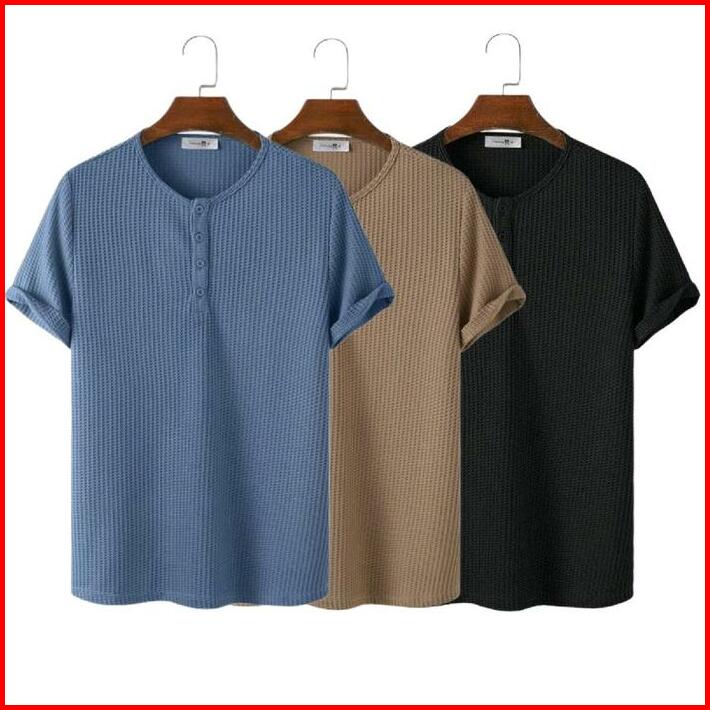 Paket Hemat 3pcs Kaos Henlay Polos Pria Dan Wanita Waffle Knit Baju Distro Oblong Kancing