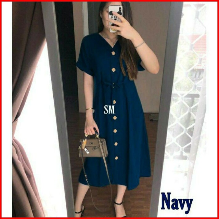Dress Wanita Biru Navy Blue Trivia Fashion Korea Style Xl Kekinian Modis Elegan Trendy Model Terbaru Midi Dress Baju Ham