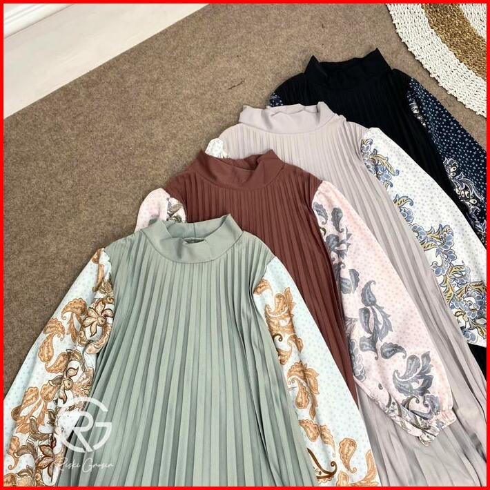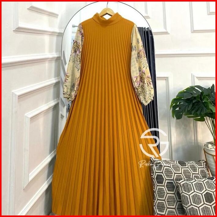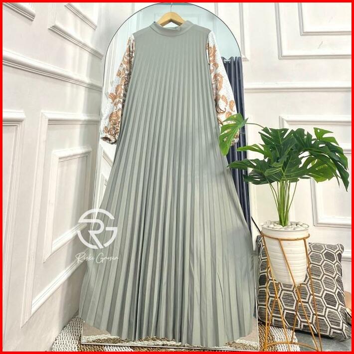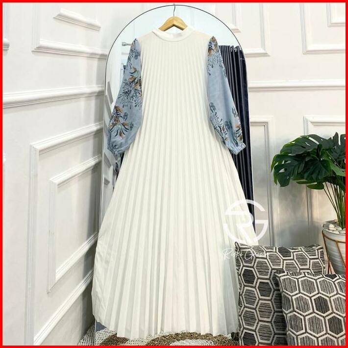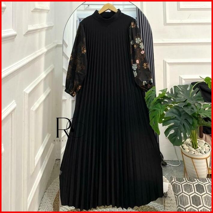 Rayya Long Dress Gamis Plisket Premium Motif Bunga Casual Panjang Silk Melar Nyaman Wanita Kancing Karet