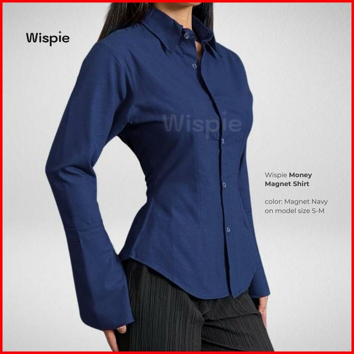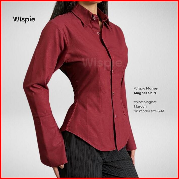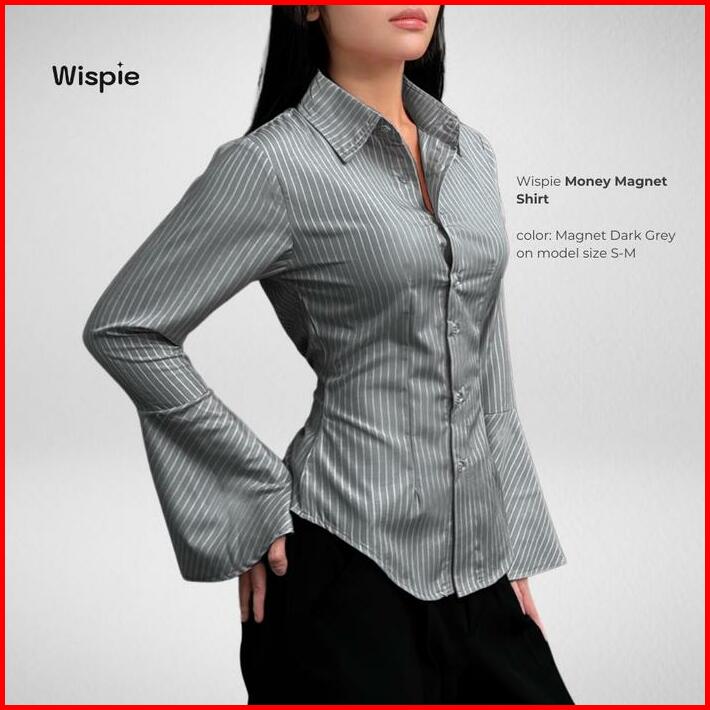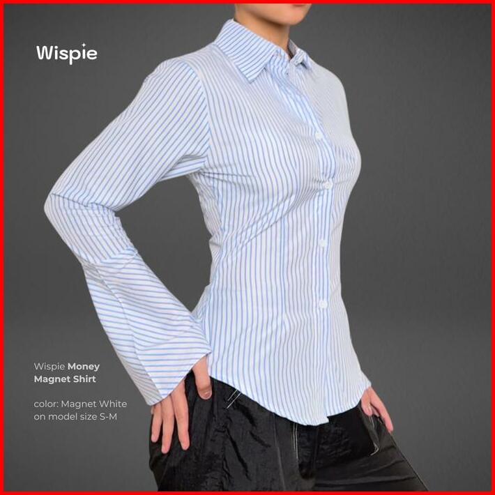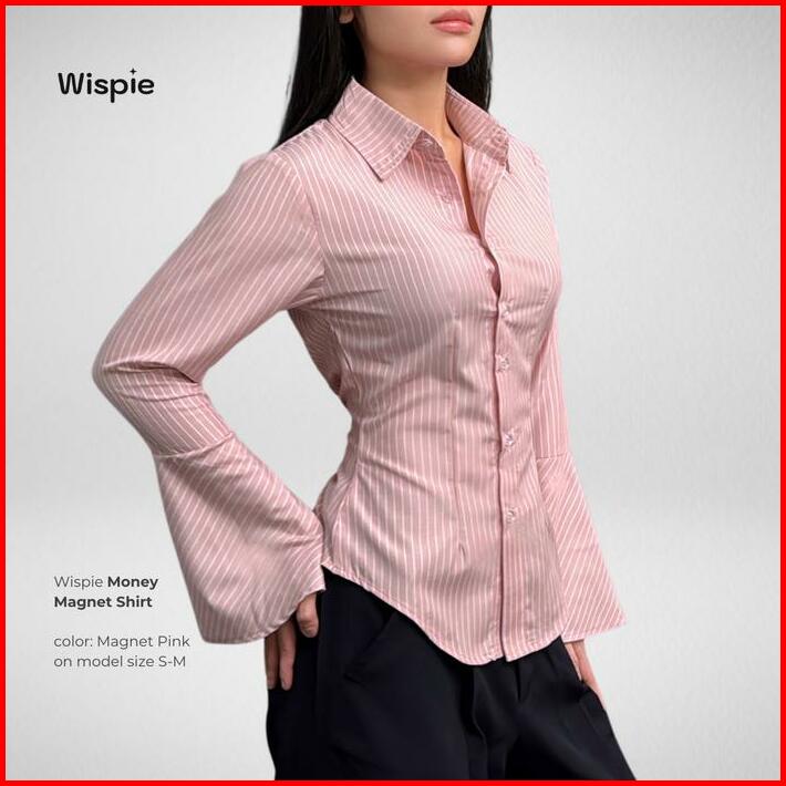 Wispie Money Magnet Fitted Shirt Kemeja Kerja Wanita Press Body Pinstripe Salur Pink Biru Berkaret