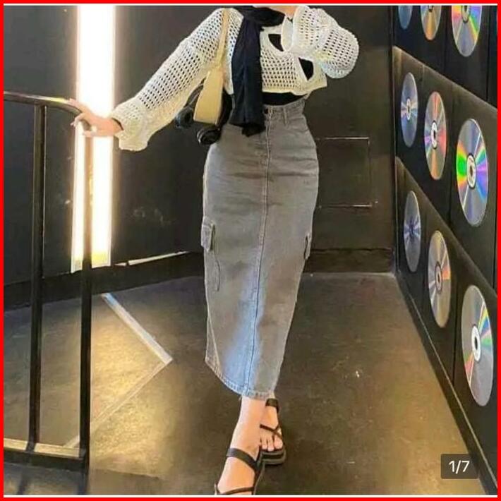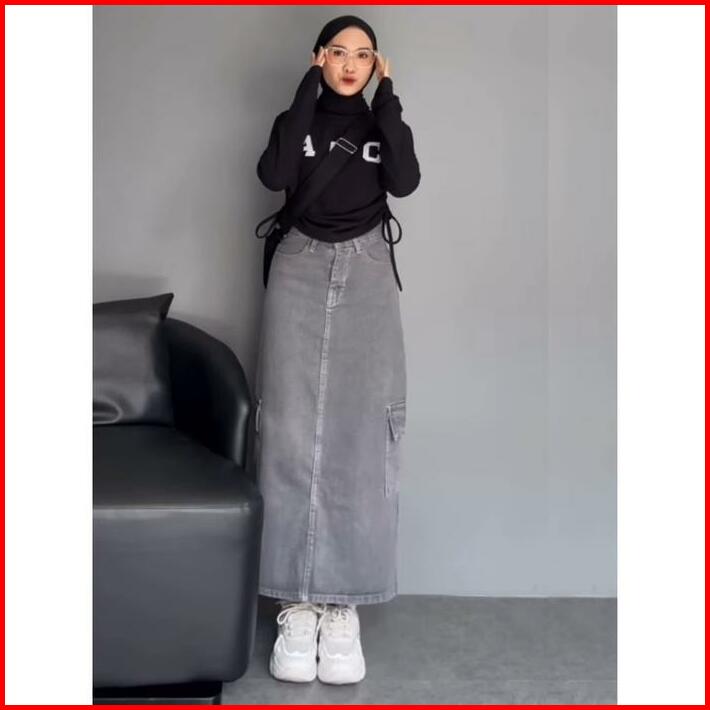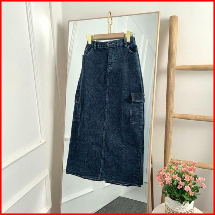 Rok Jeans Cargo Kantong Samping Highwaist Wanita Terbaru Kancing Panjang Tebal Karet Belakang Denim Span Rok Cargo Kerja