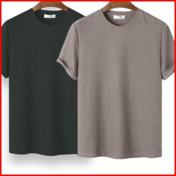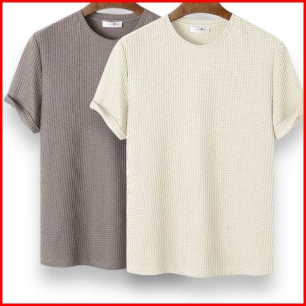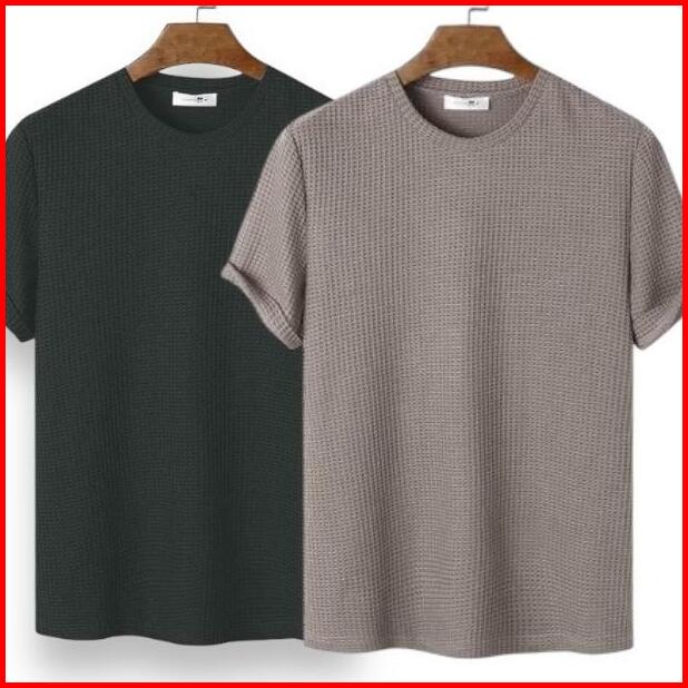 Paket 2pcis Kaos Polos Waffle Knit Lengan Pendek Atasan Pria Knitwear Panjang