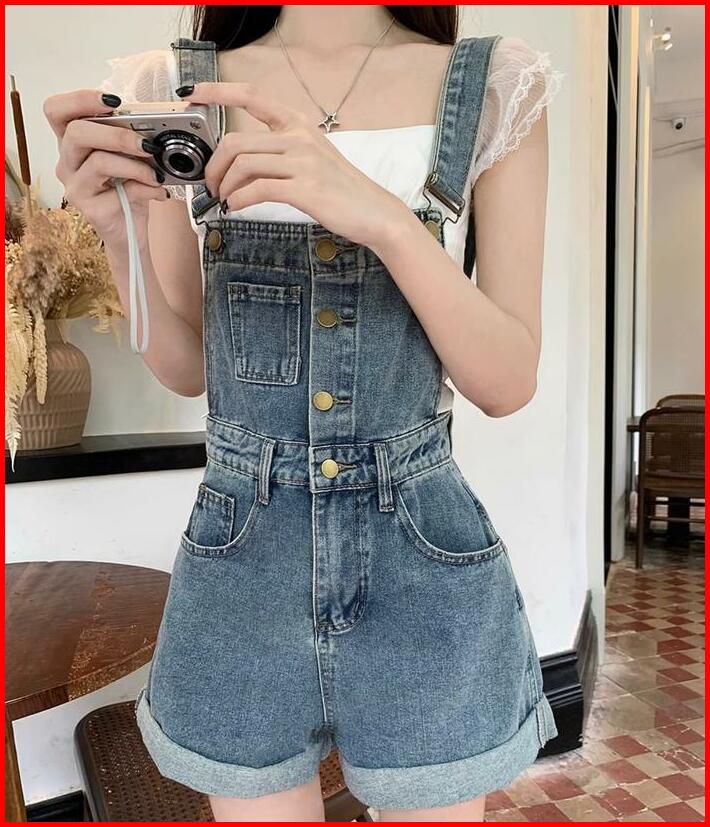 Xj0088 Retro Denim Straps Untuk Wanita Pinggang Tinggi Tub Lurus Jumpsuit Pendek Panjang Jeans Celana High Waist Kaki Lo