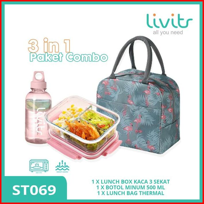 Livits Lunch Box Kaca 2 3 Sekat Kotak Makan Kaca Tebal Kedap Udara 960 Ml 1000 Ml Biru Pink