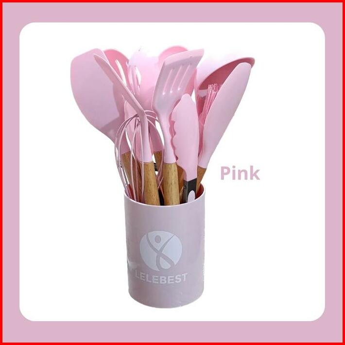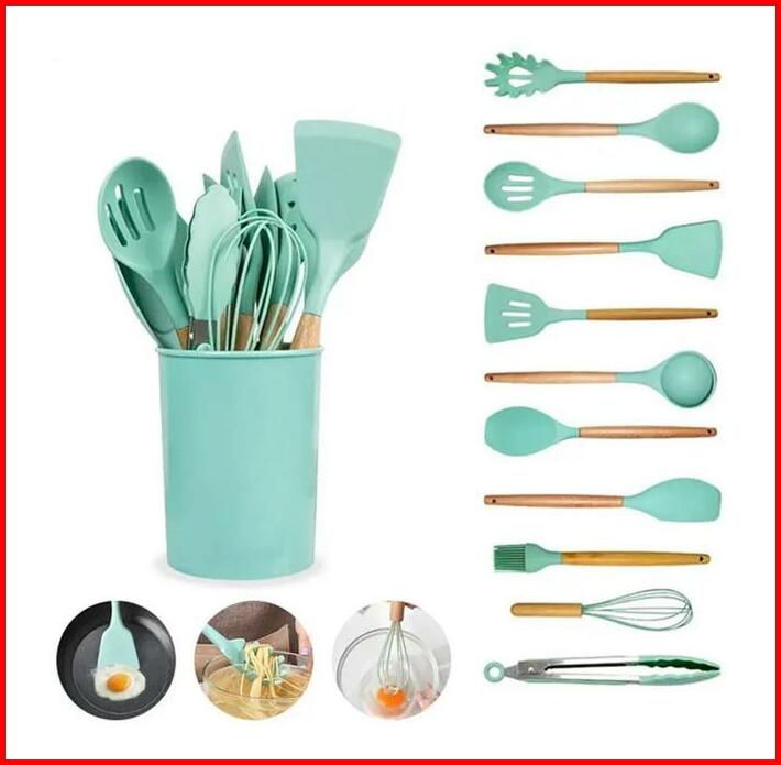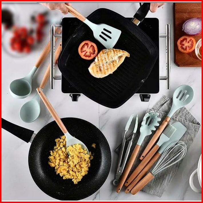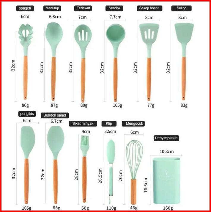 Silicone Utensil 11pcs Wadah Spatula Peralatan Masak Sutil Pegangan Kayu Baking Set Alat Masak Kuas Sendok Silikon Kitch