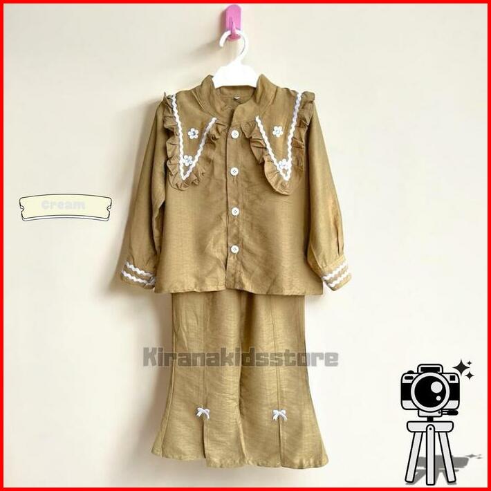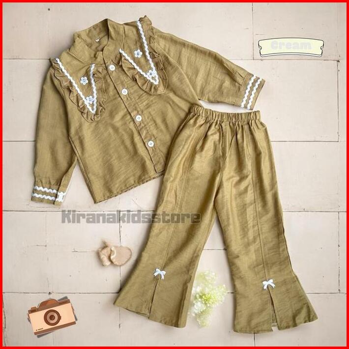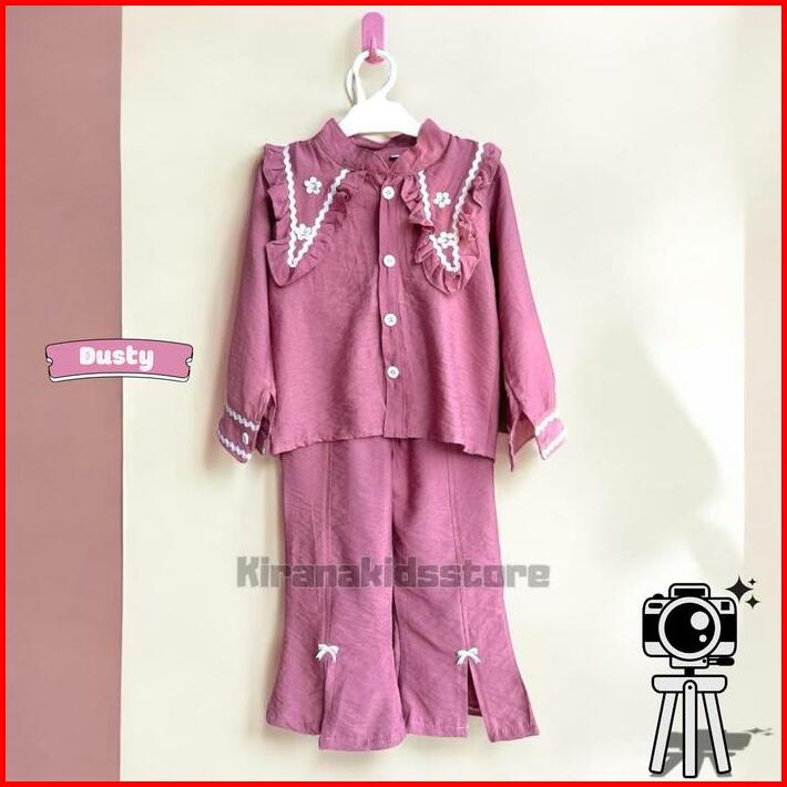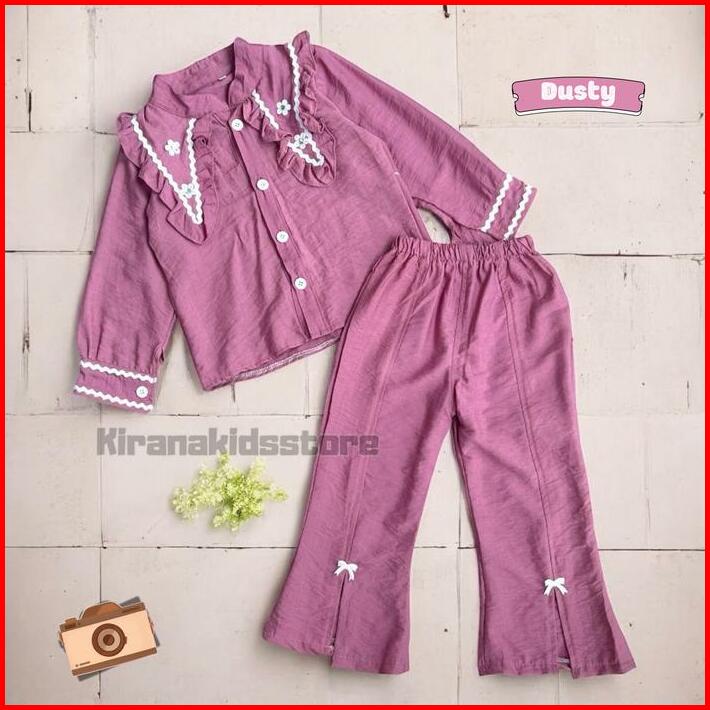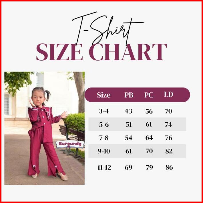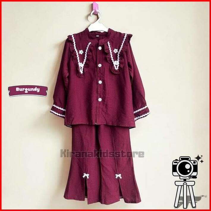 One Set Baju Kemeja Burgundy Lebaran Anak Perempuan Usia 3 Sampai 12 Tahan Celana Cutbray Setelan