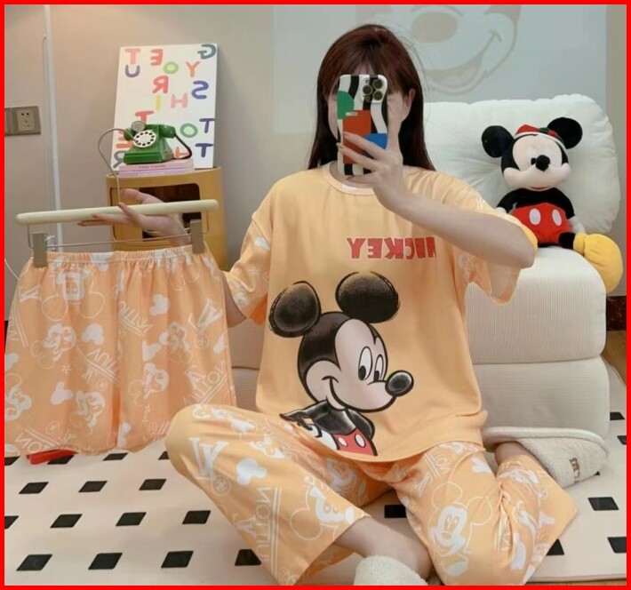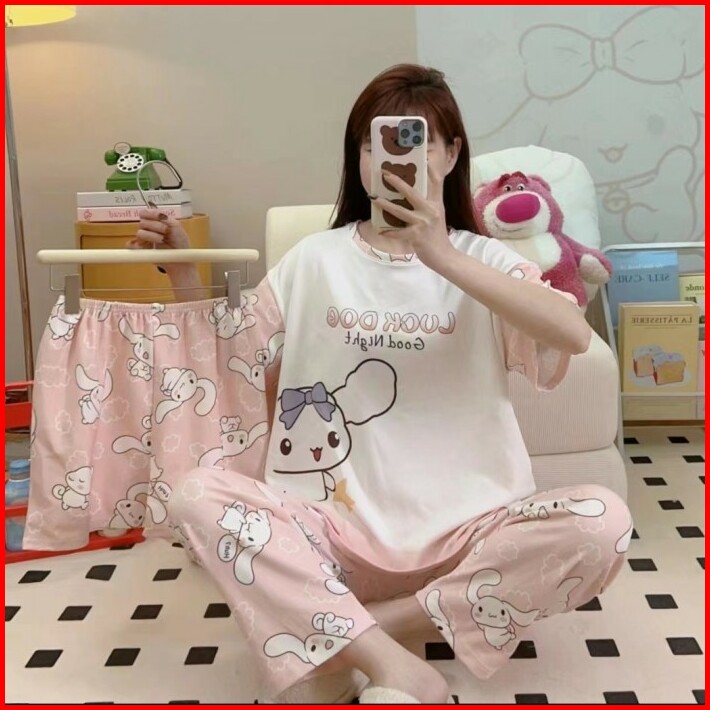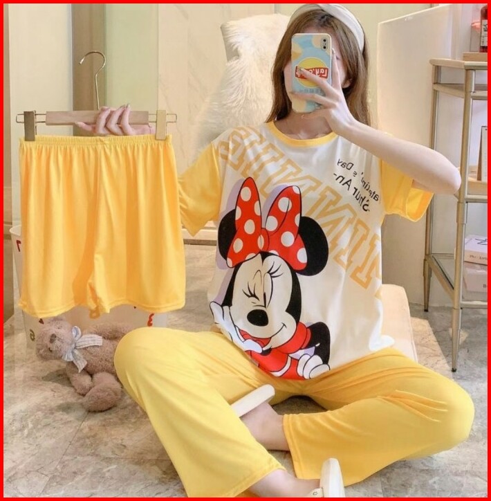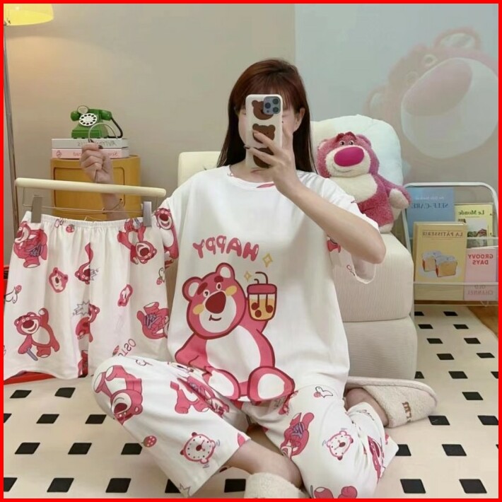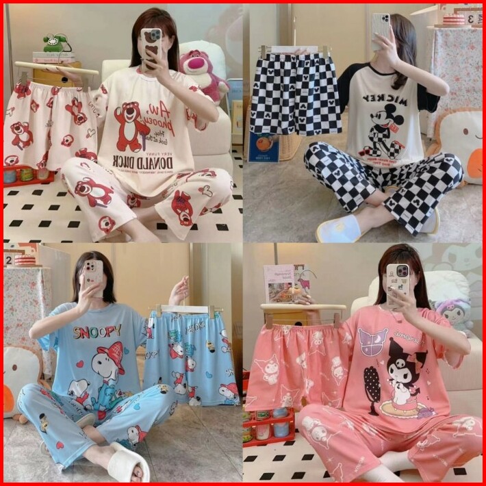 Baju Tidur Setelan 3 In 1 Wanita Piyama Import Bahan Kaos Spandek