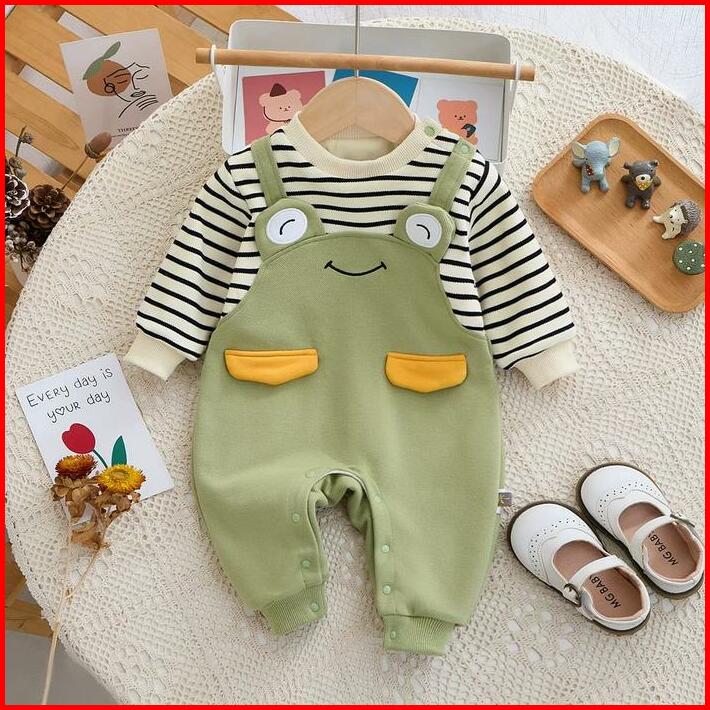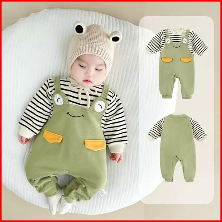 Jumper Bahan Katun Bayi Laki-laki Dan Perempuan Usia 0-18 Bulan Jumpsuit Lengan Panjang Motif Salur Karakter Lucu