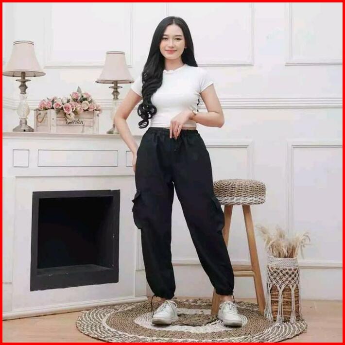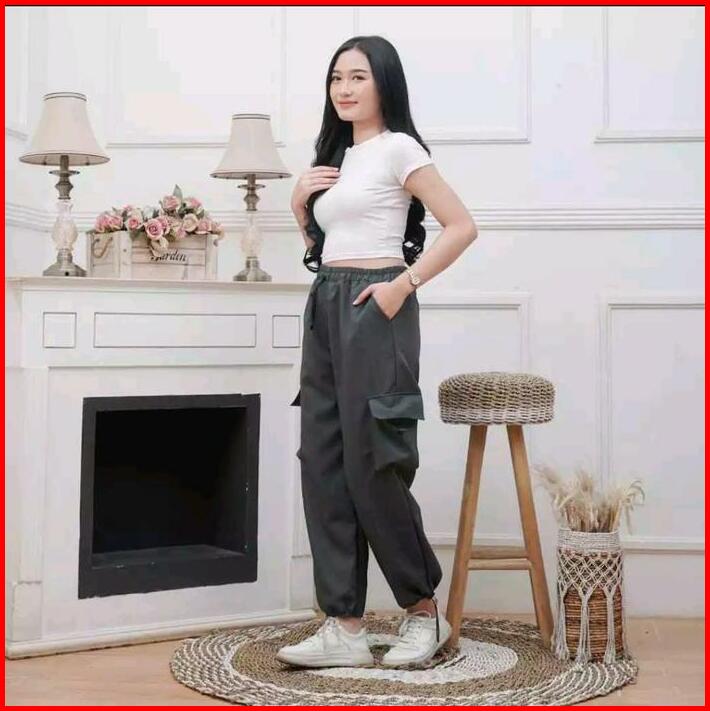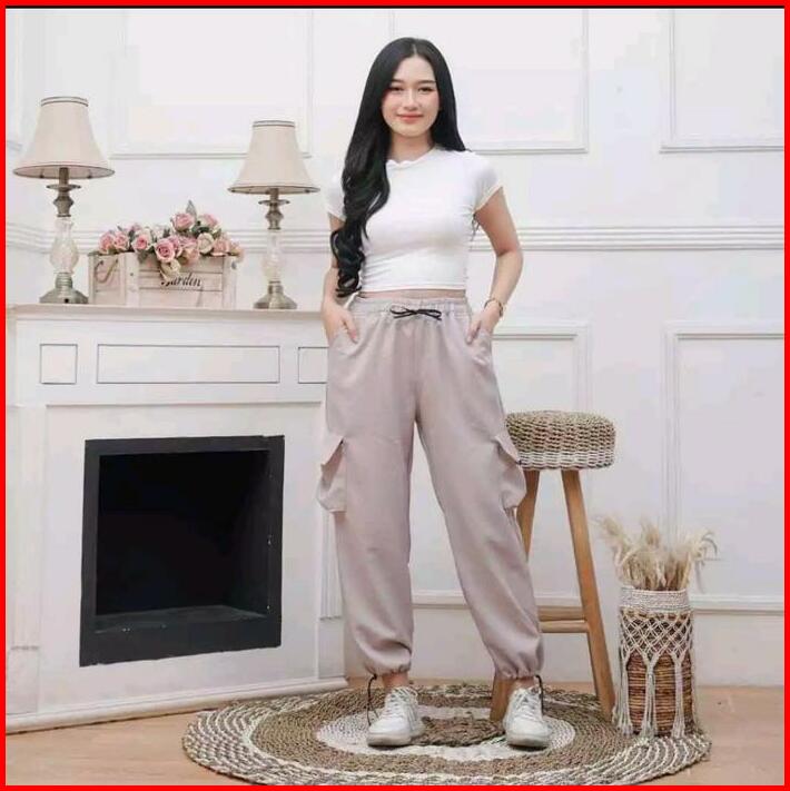 Celana Cargo Wanita Panjang Highwaist Loose Pants Wanita Korean Style Standart Jumbo Kaki Serut
