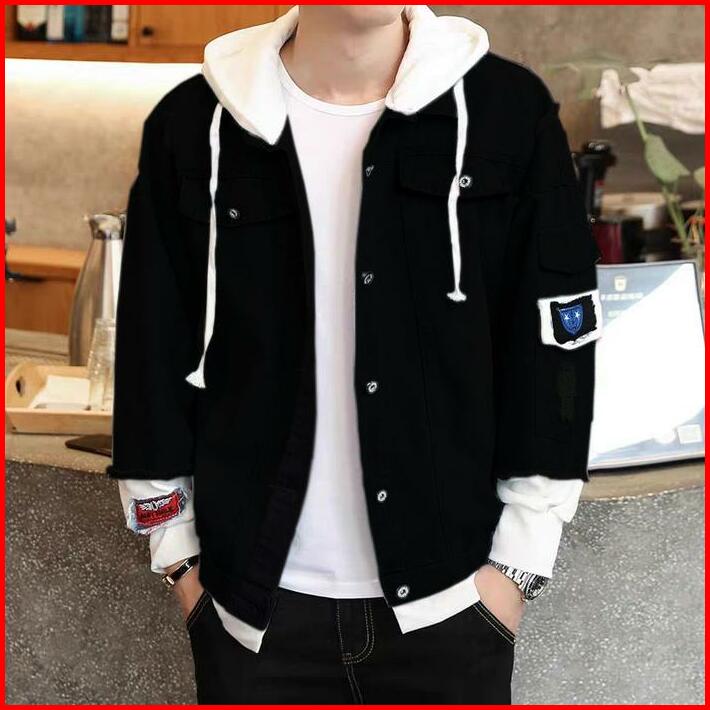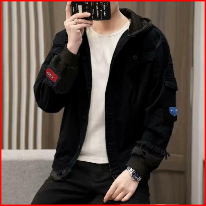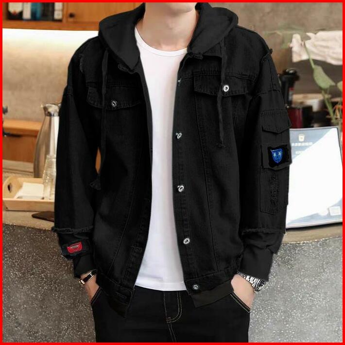 Jaket Jeans Korean Style Lotto Black Denim Kantong Pria Panjang Casual Hitam Blazer Formal Cowok