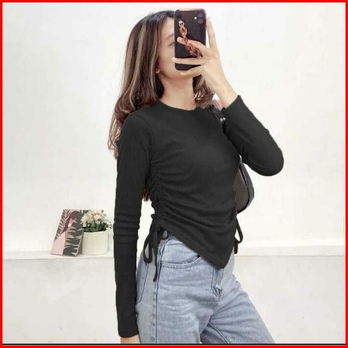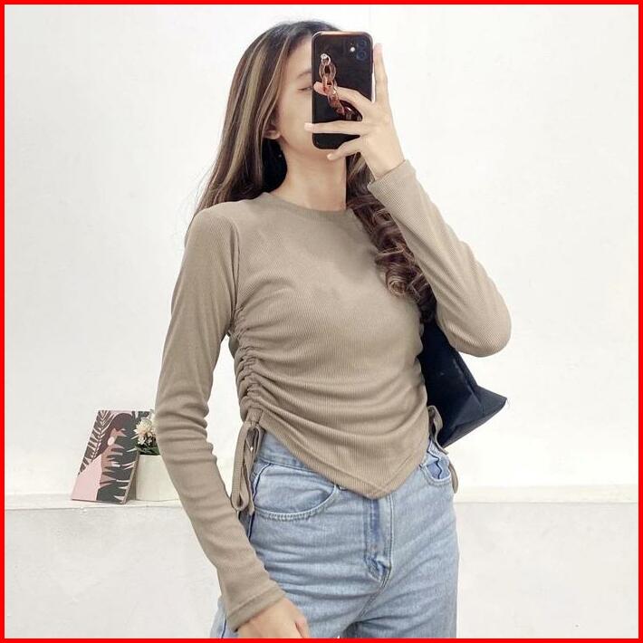 Valen Top Blouse Tali Serut Rib Knit Atasan Wanita Lengan Panjang