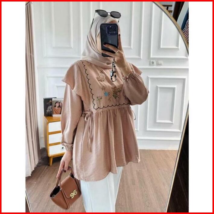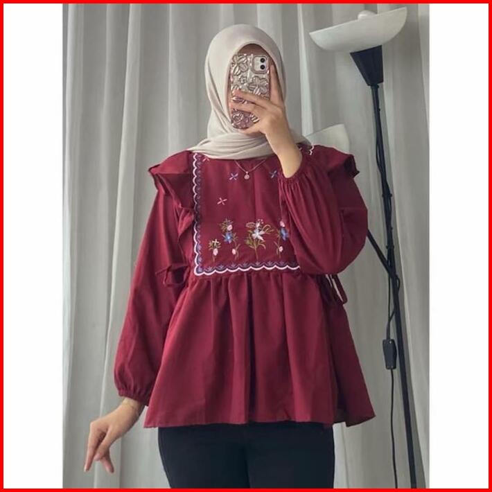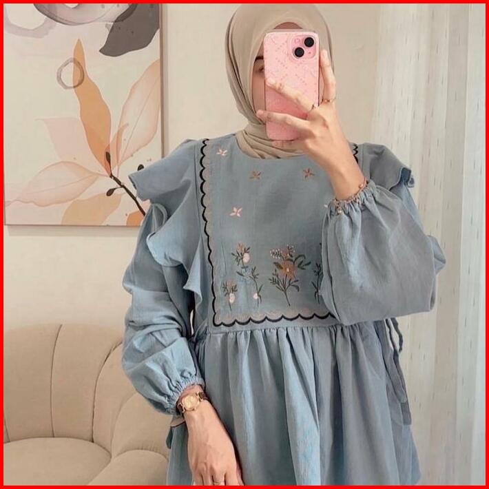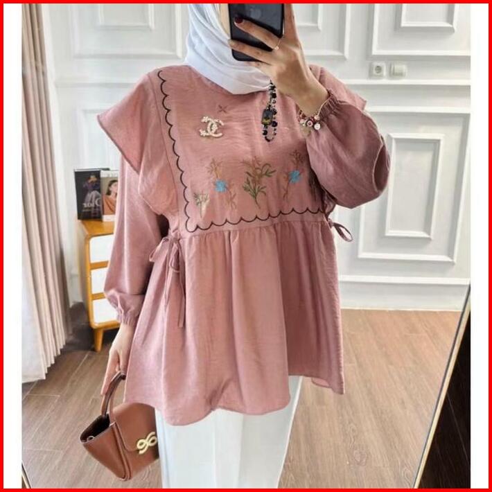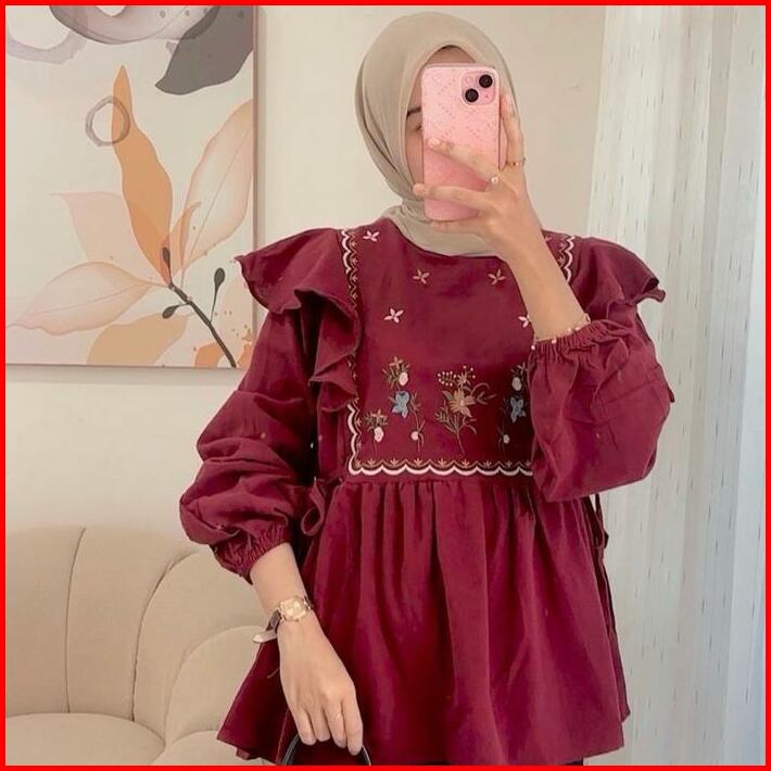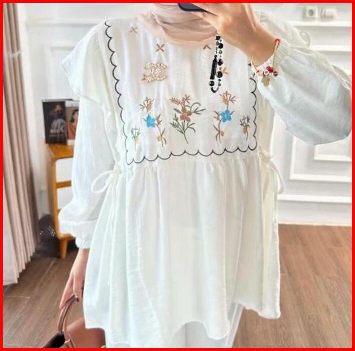 Kd Blouse Atasan Bordir Wanita Pure Linen Premium Baju Dewasa Panjang Casual Cewek Katun Kancing
