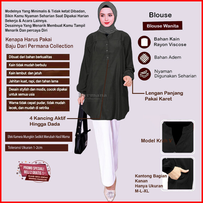 Baju Atasan Blouse Wanita Kemeja Lengan Panjang Hitam Jumbo Dewasa