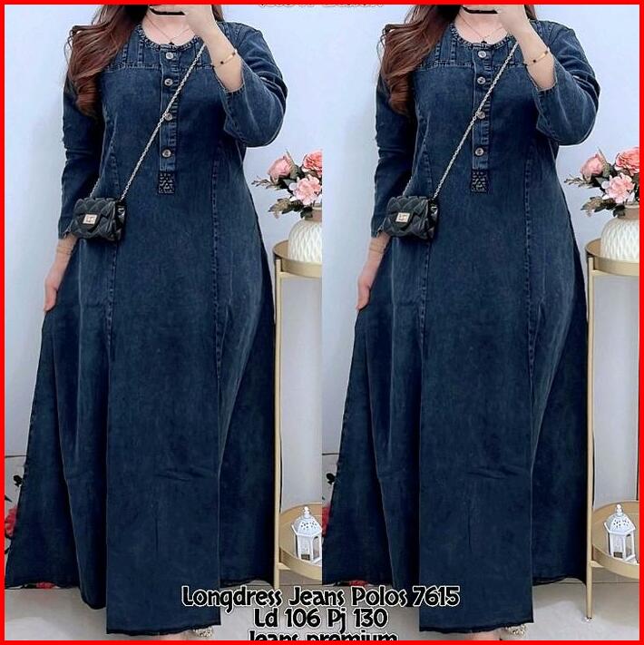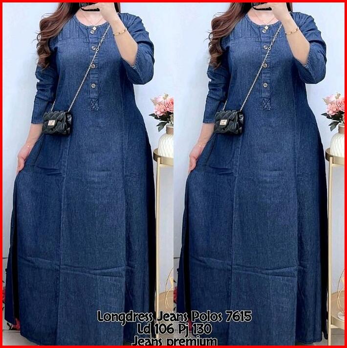 7615 Long Dress Jeans Polos Lengan Panjang Wanita Maxi Dress Jeans Gamis Gamis Jeans
