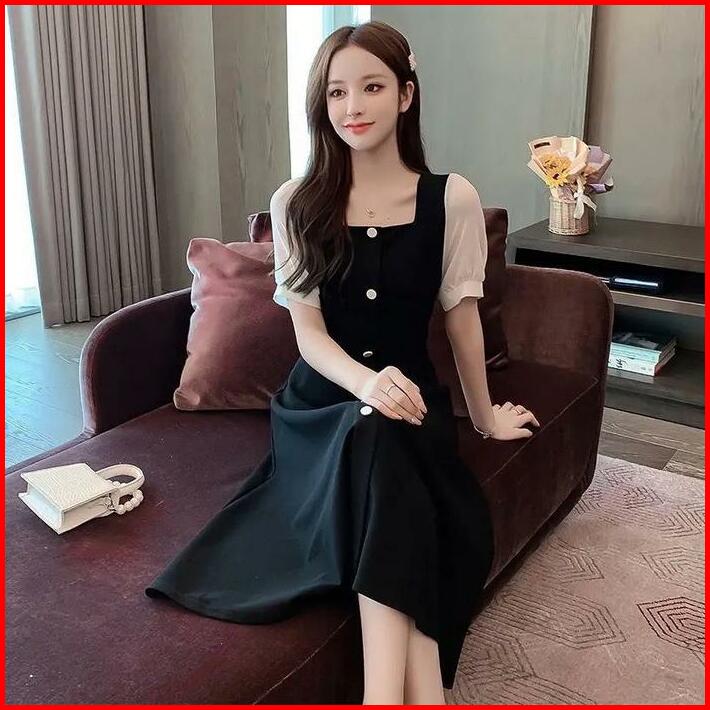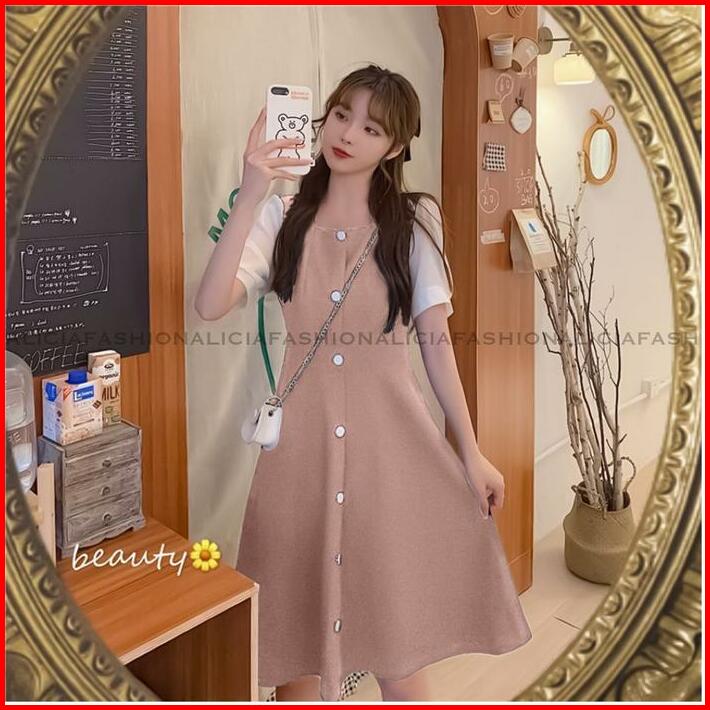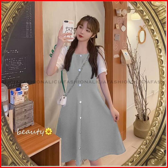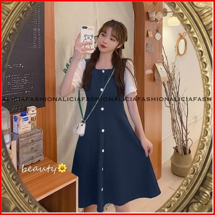 Alicia Monica Midi Dress Korean Leher Kotak Full Kancing Dengan Cuttingan A-line Polos Casual Wanita Cantik Kiyowo Busui
