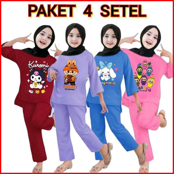 4pcs Setelan Anak Wanita Viral Usia 3-12 Thn Paket Hemat 4 Setel Anak Celana Fashion Baju