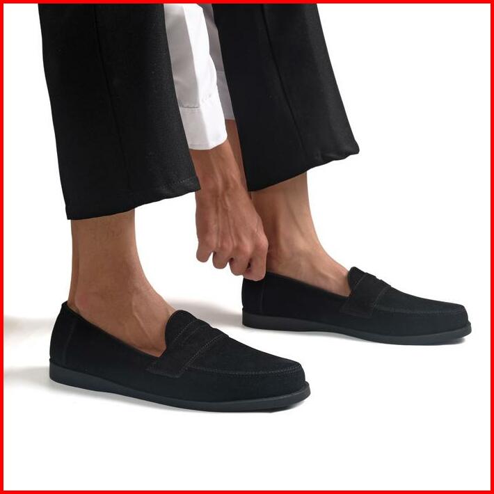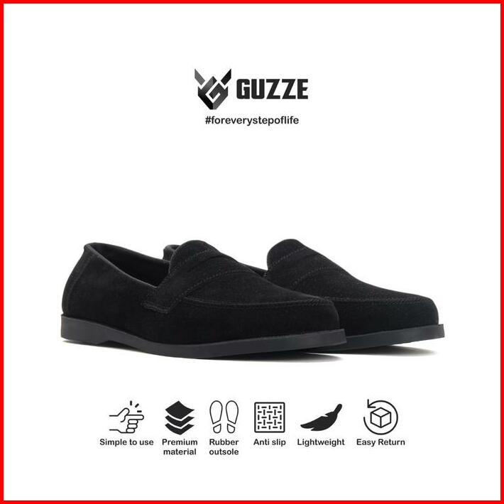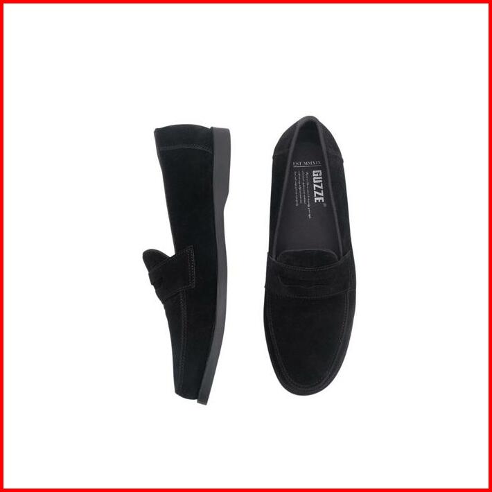 Sepatu Slip On Loafers Suede Pria Guzze Amber Black Casual Flat Shoes