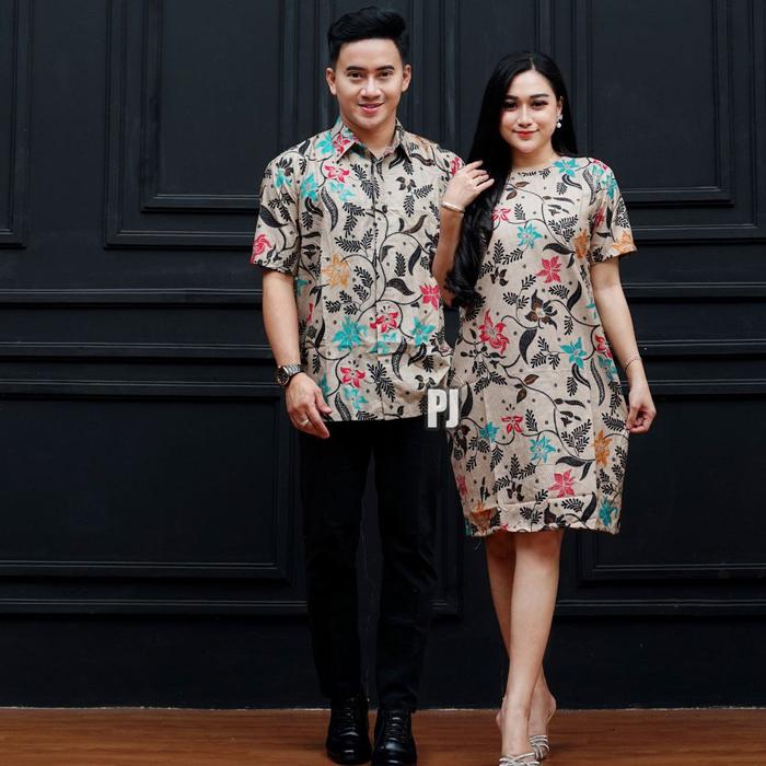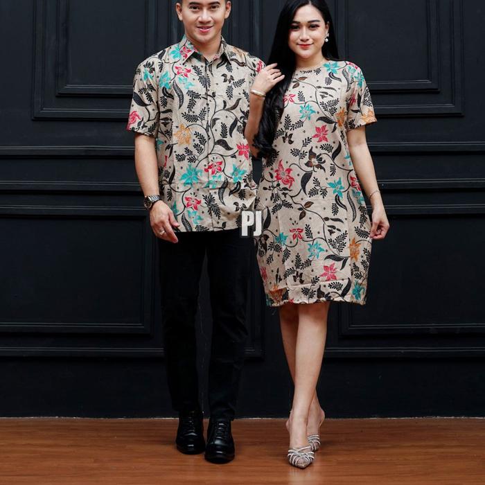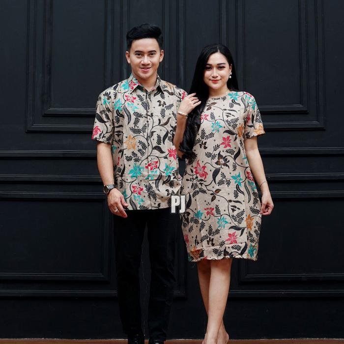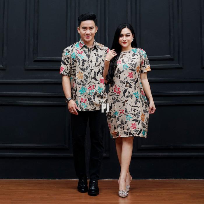 TANPA DP BAJU DRESS BATIK COUPLE LENGAN PENDEK MOTIF TERATAI CREAM WANITA PASANGAN SERAGAM SARIMBIT ATASAN KATUN KERJA COPLE DR TERATAI PRIA M WANITA M