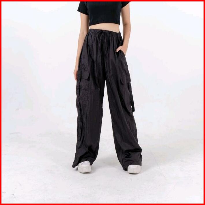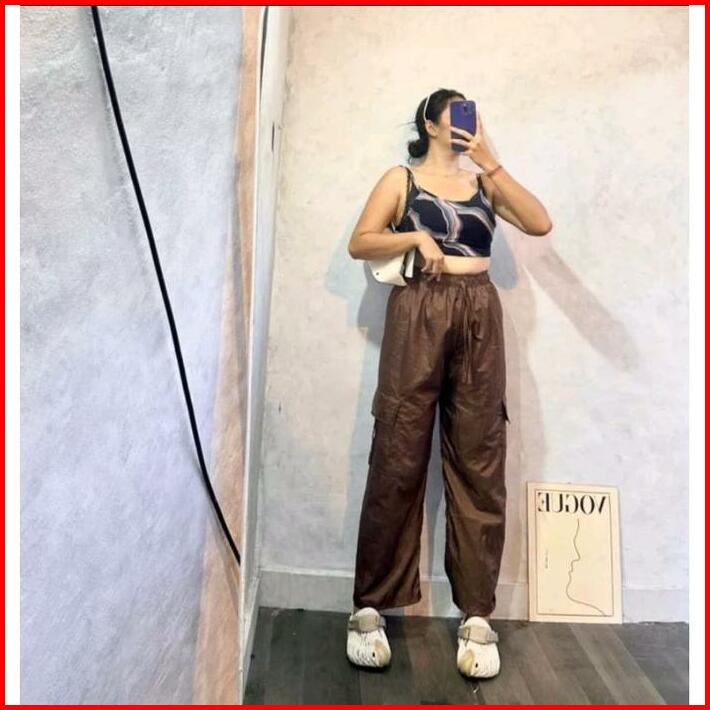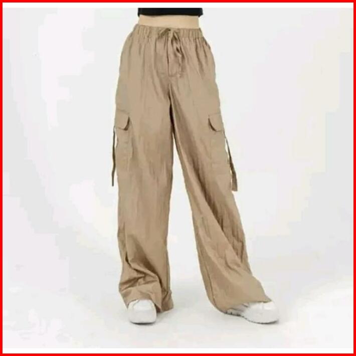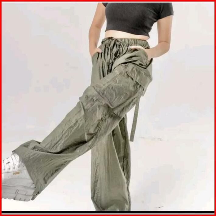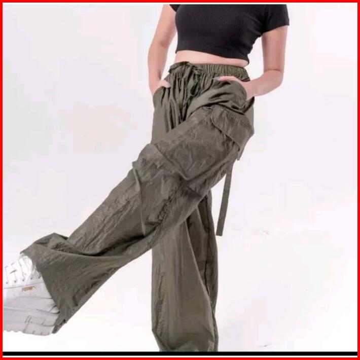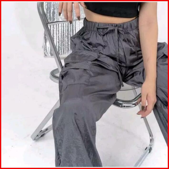 Cargo Pants Celana Cargo Parasut Kulot Wanita Panjang Karet Kantong Merlinz Linen Bawahan Crinkle Casual Loose Korean Re
