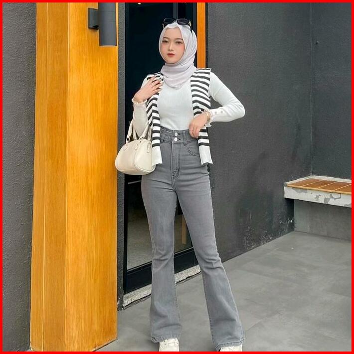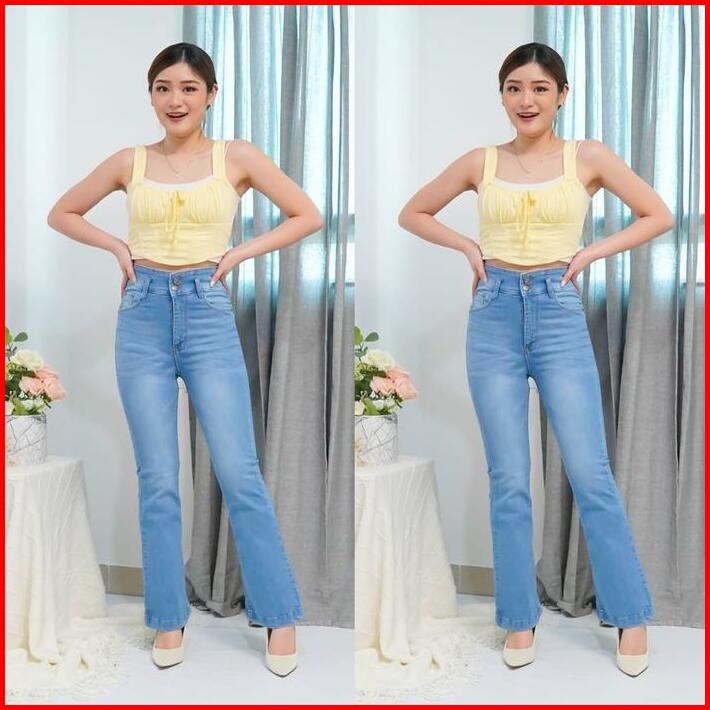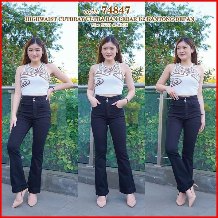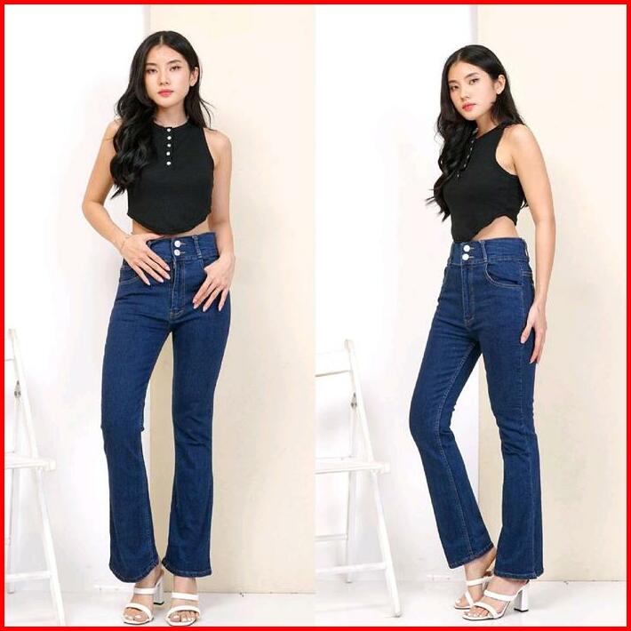 Celana Highwaist Cutbray Kancing 2 Cky Jeans Wanita Panjang Cewek Denim Skinny Karet Hitam