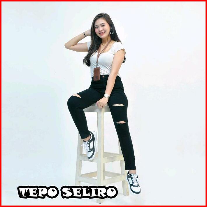 Celana Hw Jeans Highwaist Hitam Sobek 3 Jumbo Nyaman Skinny Slim-fitting Wanita Vintage Korean Premium Kantong Melar Pan