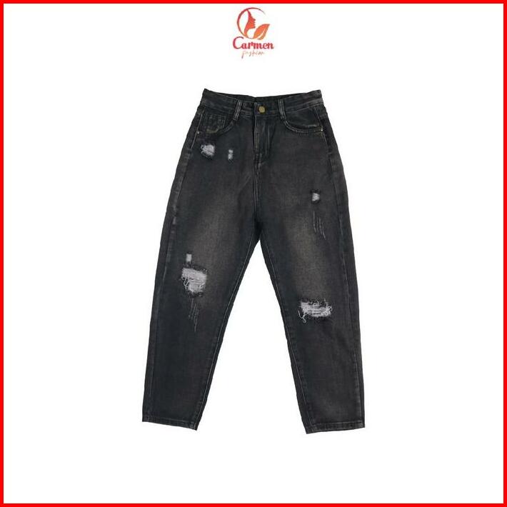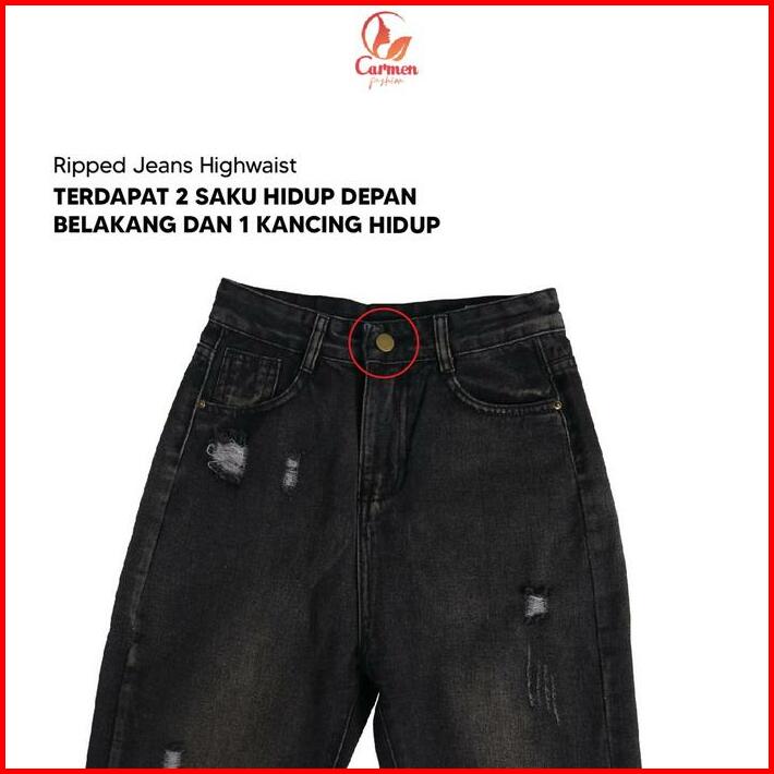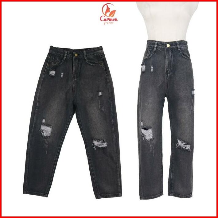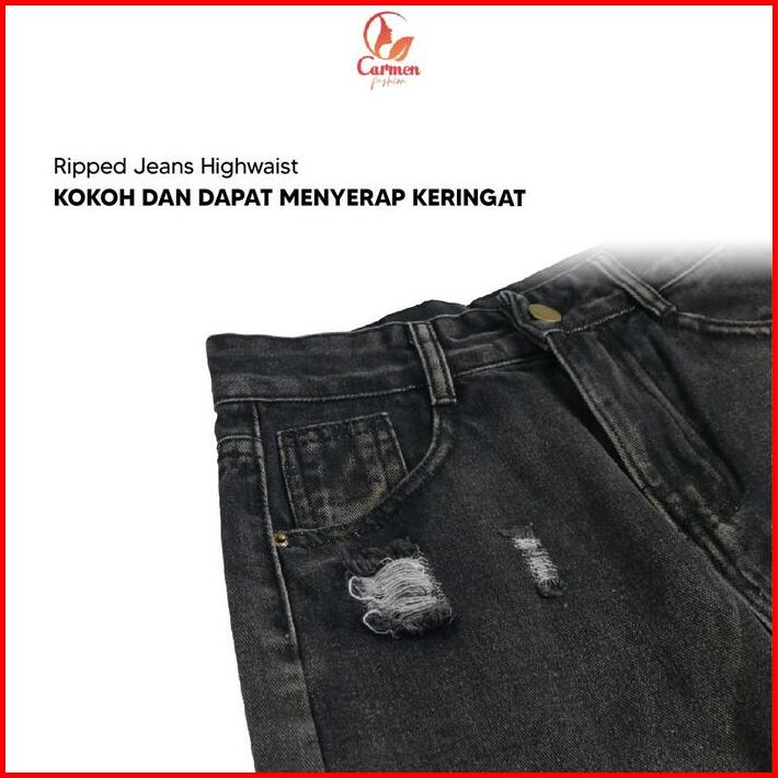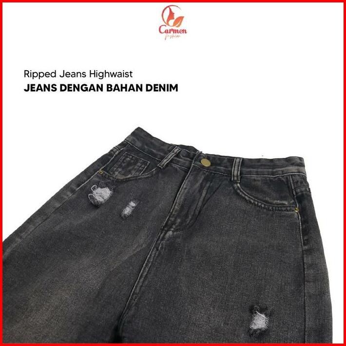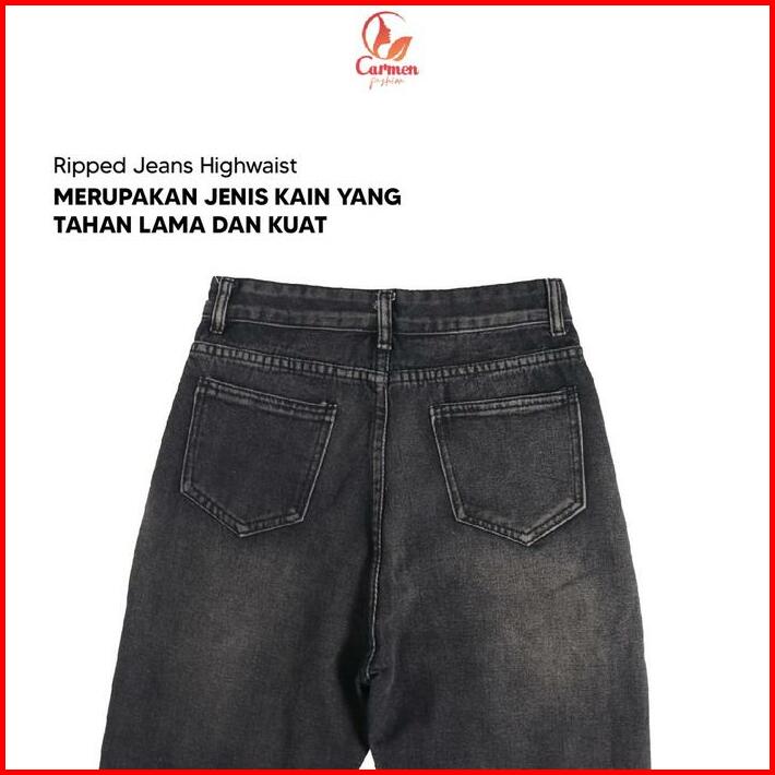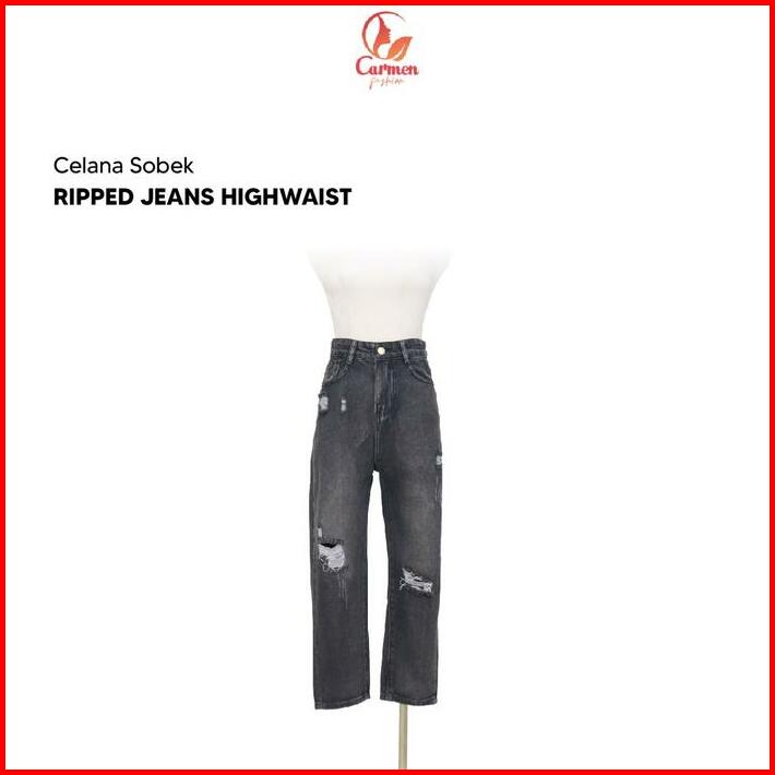 Celana Ripped Jeans Highwaist Boyfriends Panjang Wanita Fashion Kekinian Style Cf P525 Hitam Abu