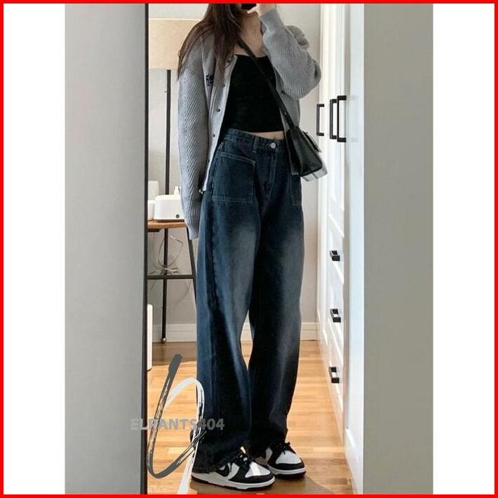 Elpants Langsung Kirim Celana Jeans Wanita Highwaist Kulot Jeans Saku Depan Retro Korean Style Loose Panjang Hitam