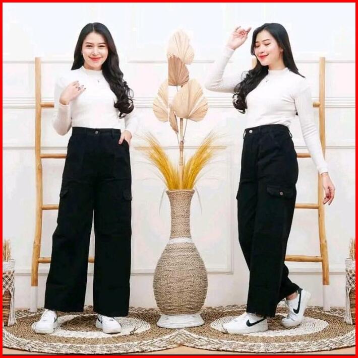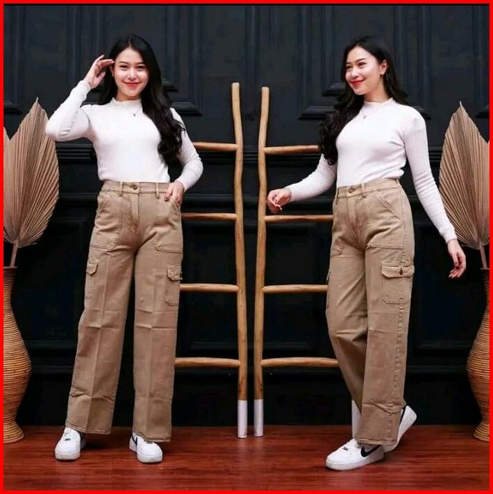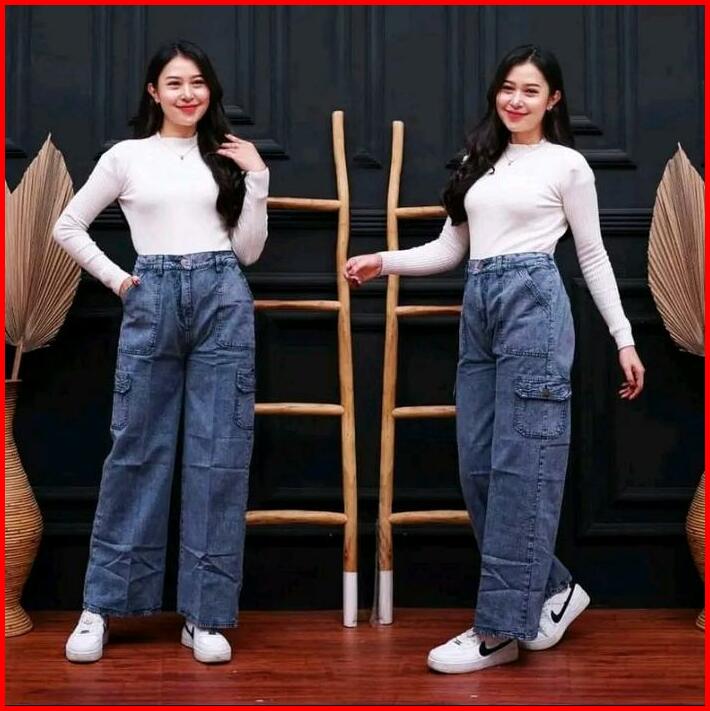 Celana Kulot Cargo Jeans Kulot Highwaist Wanita Kulot Cargo Jeans Panjang Nyaman Santai Loose Denim Biru