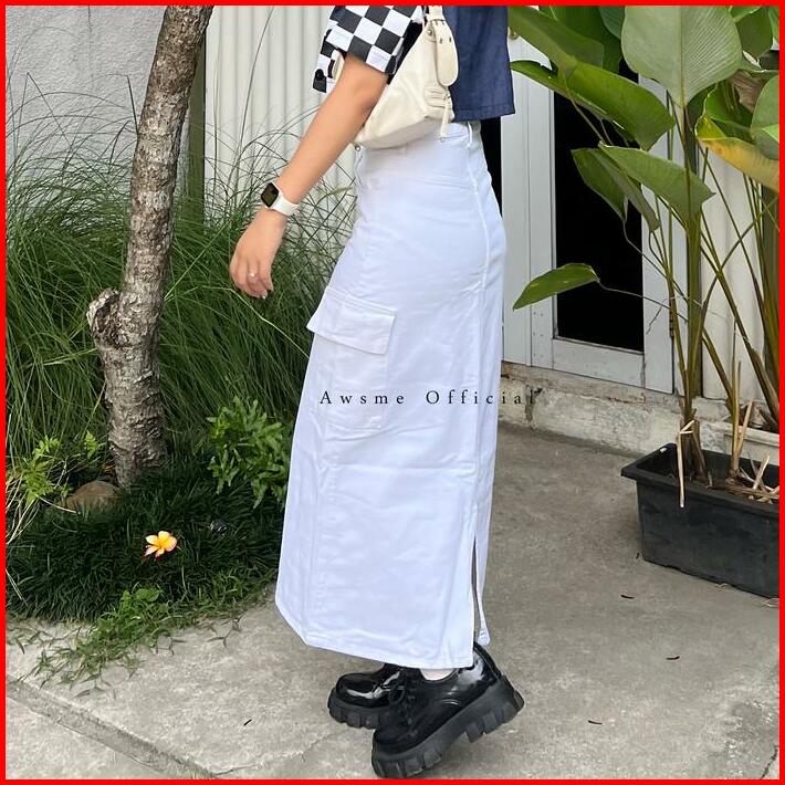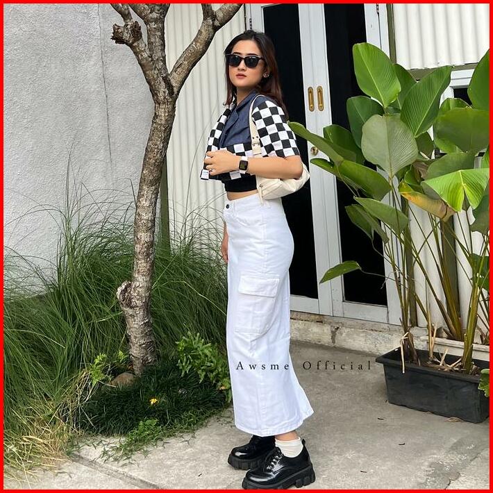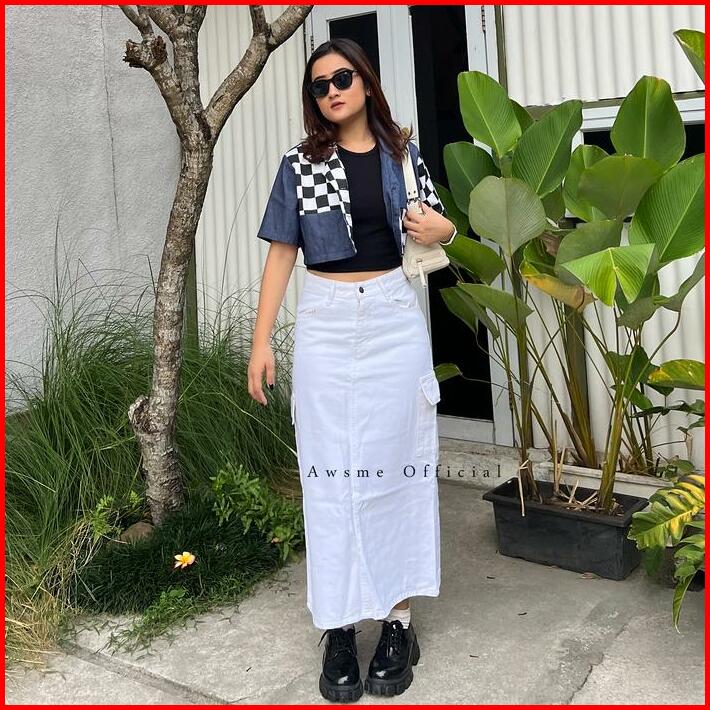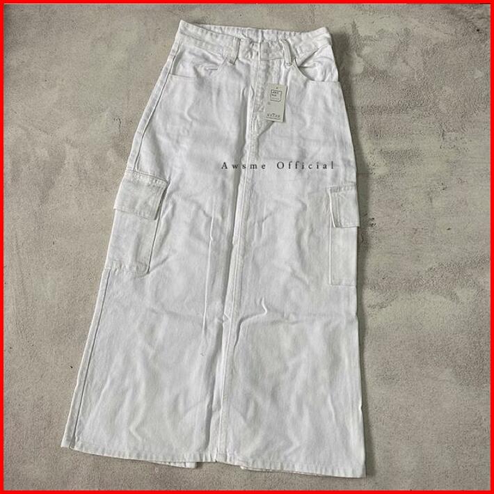 Rok Cargo Jeans White Celana Wanita Highwaist Midi Skirt Putih