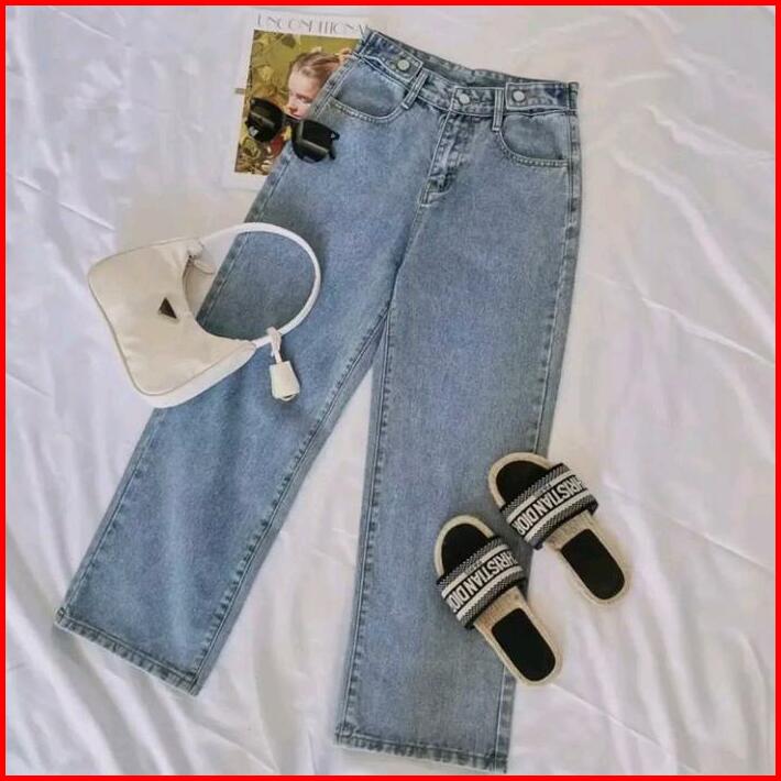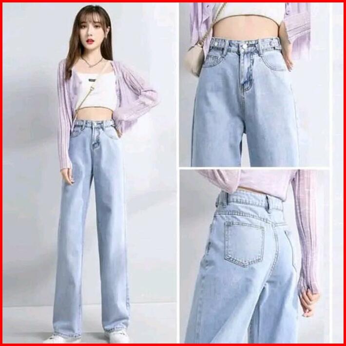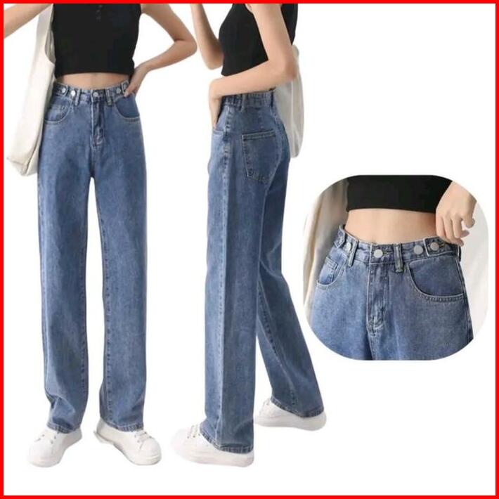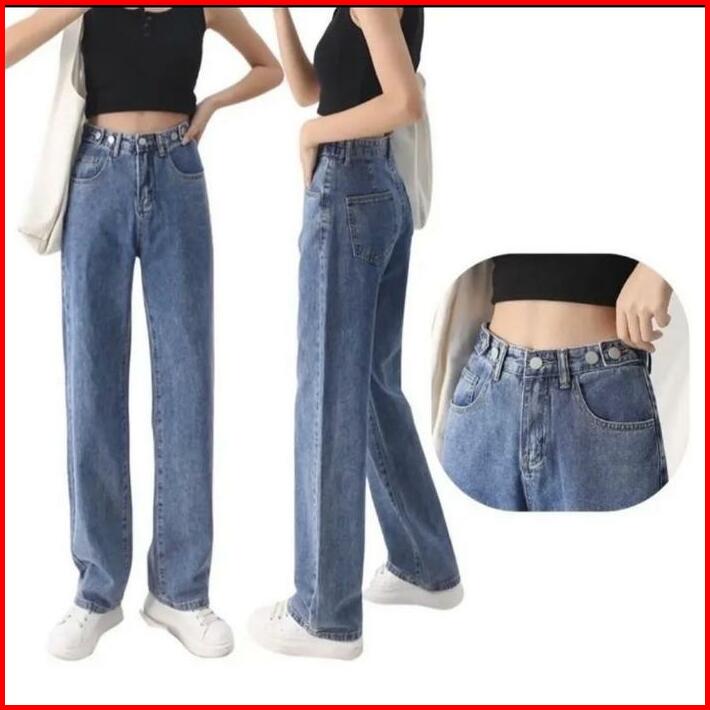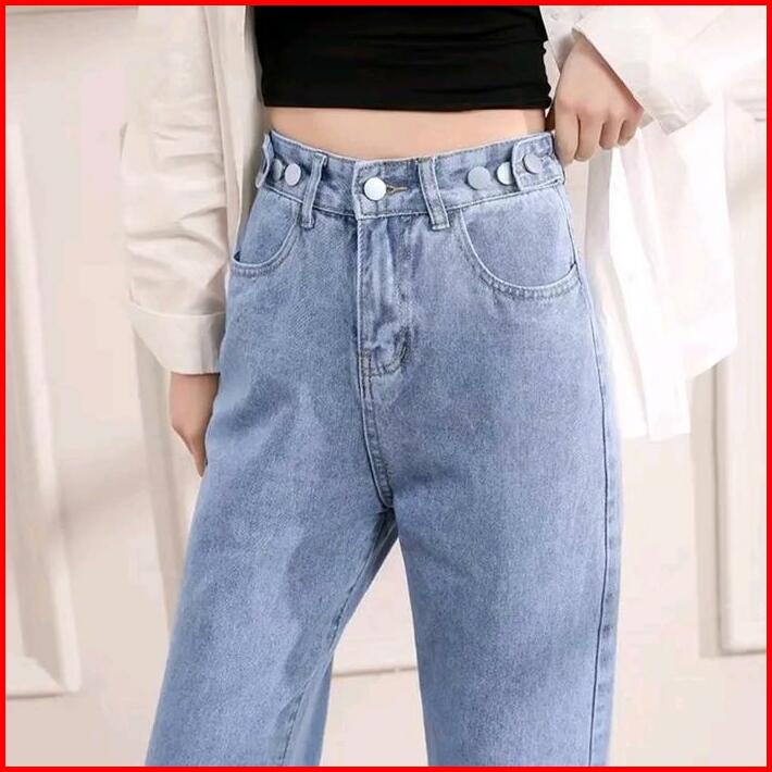 Jinskuy- Celana Highwaist Jeans Wanita Pinggang Kancing Yang Dapat Di Sesuaikan Polos