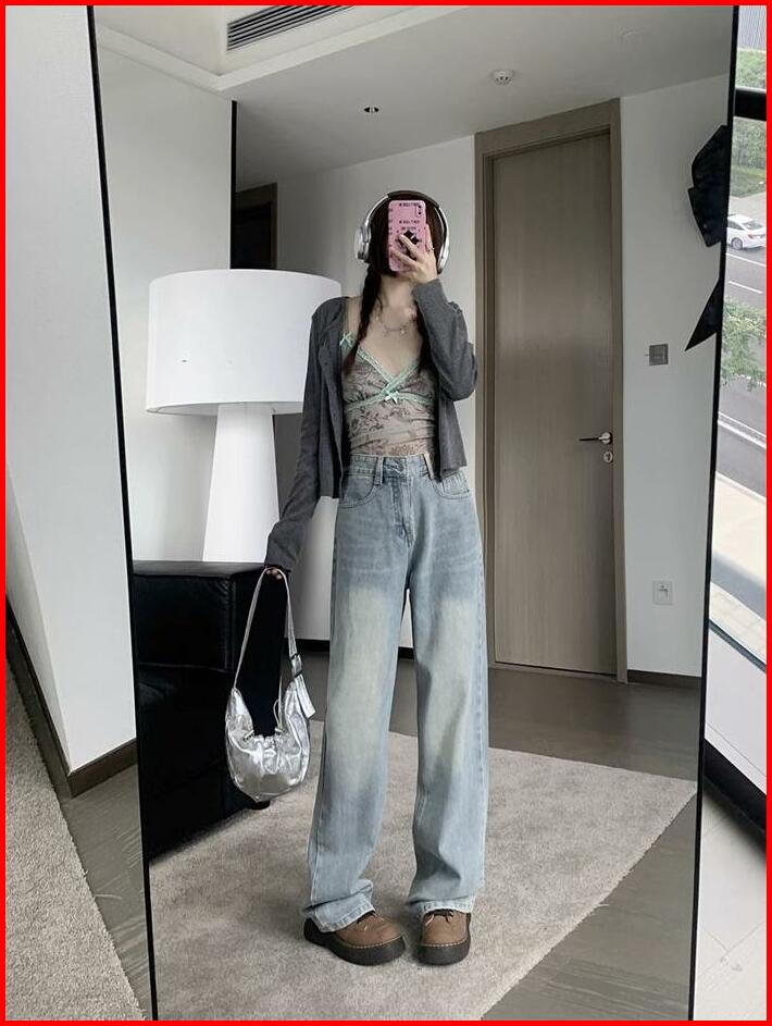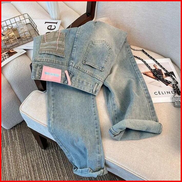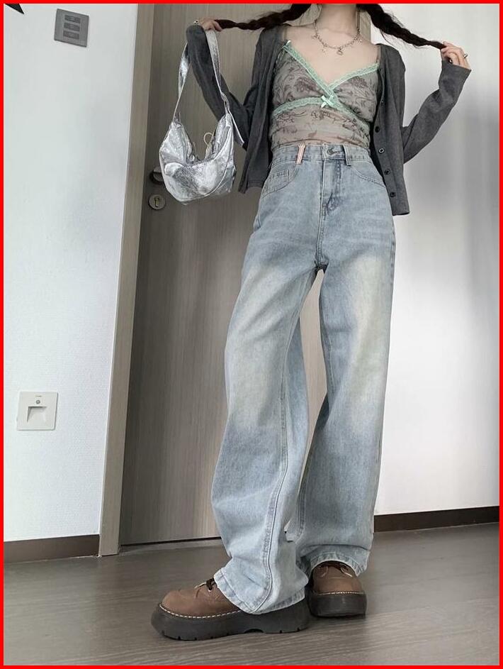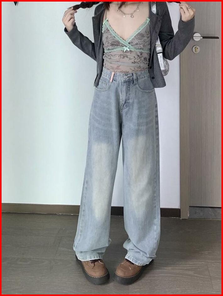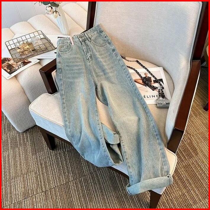 Jomelinjeans - Jns-504 Celana Jeans Highwaist Wanita Korean Style Straight Loose Pants Pola Benang Panjang Denim Biru