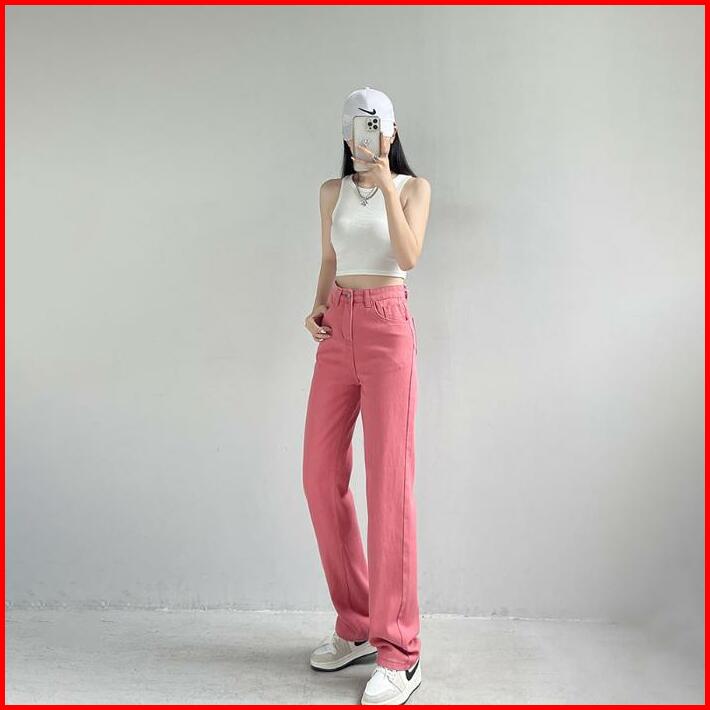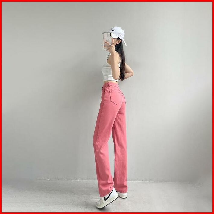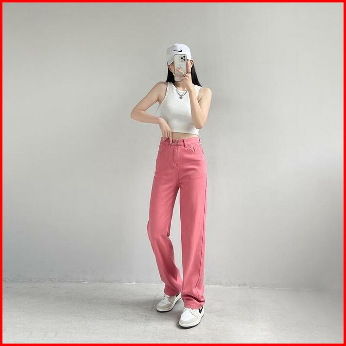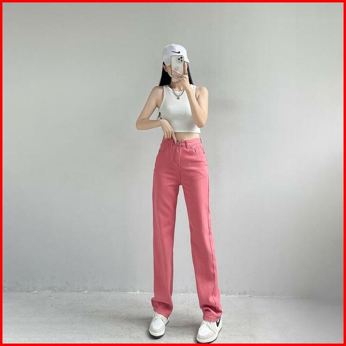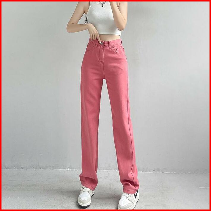 2023 New Highwaist Celana Panjang Jeans Wanita Loose Kulot Pink Import