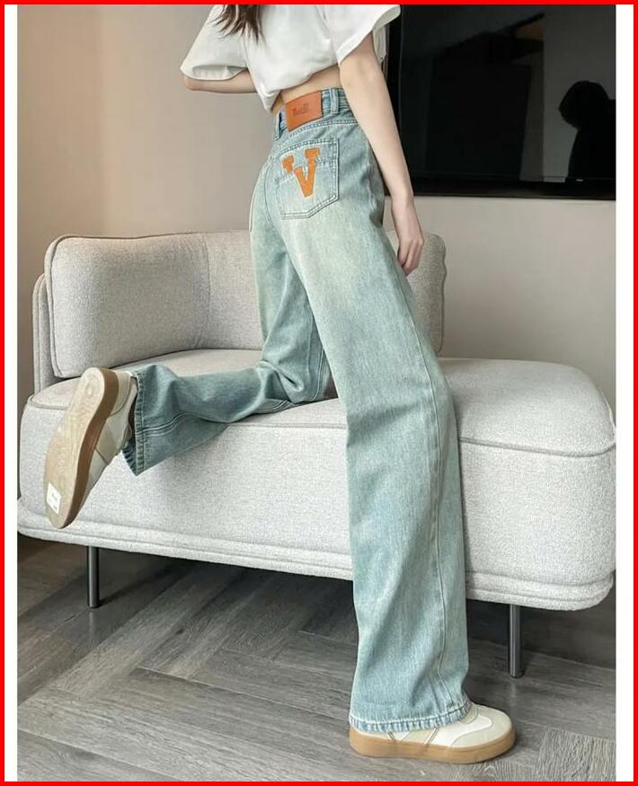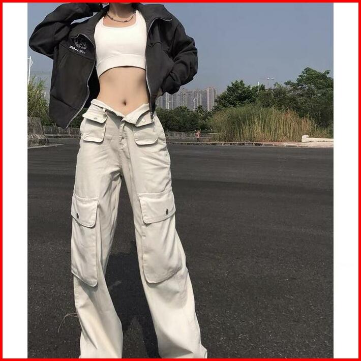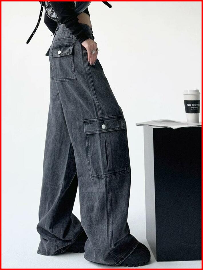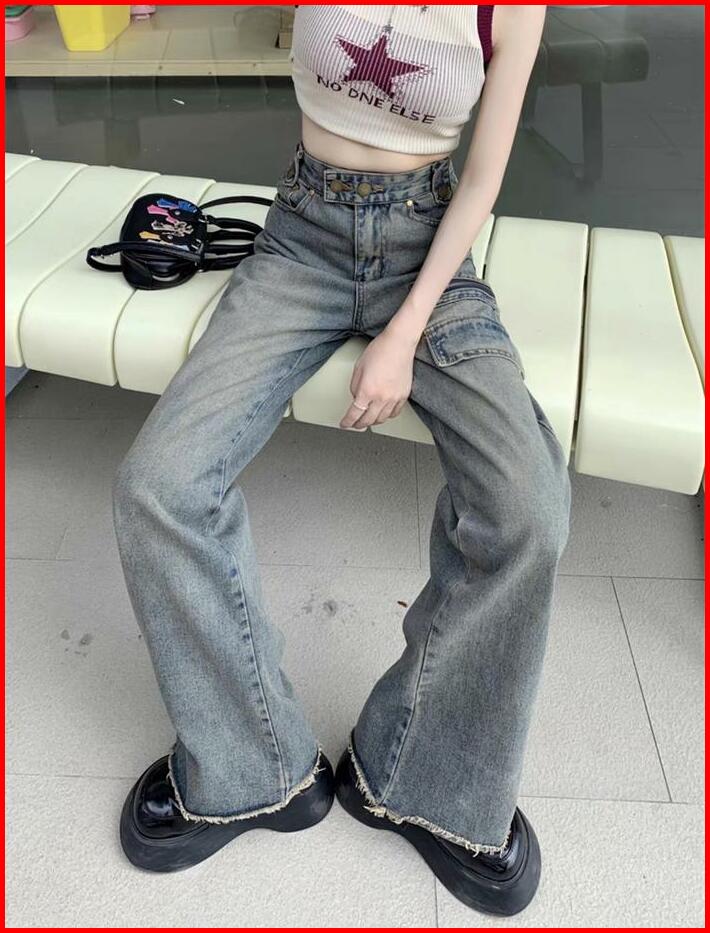 Hazo Jeans-biru Cargo Jeans Korea Style Highwaist Loose Celana Jeans Wanita Muda Panjang Retro Straight