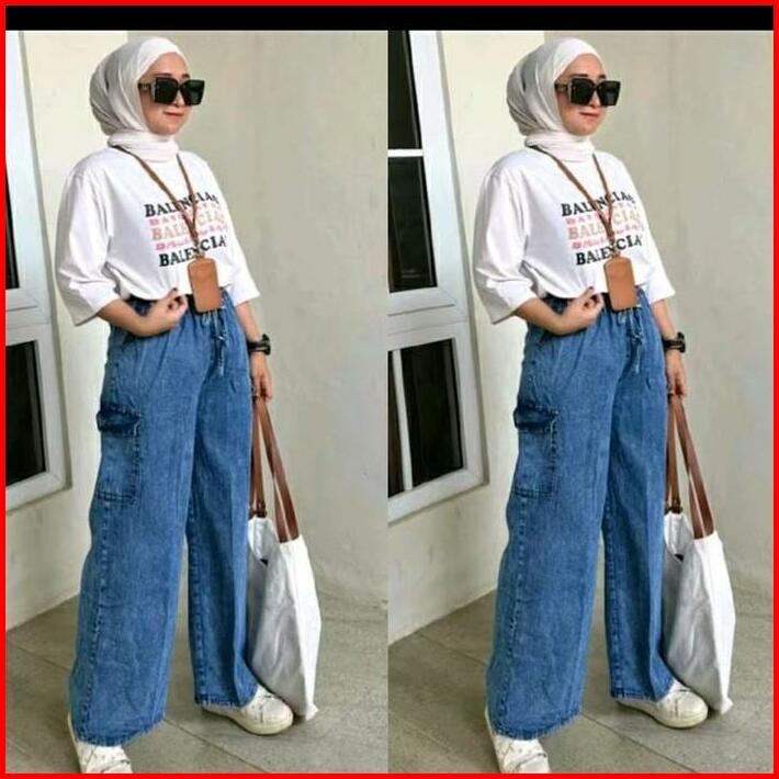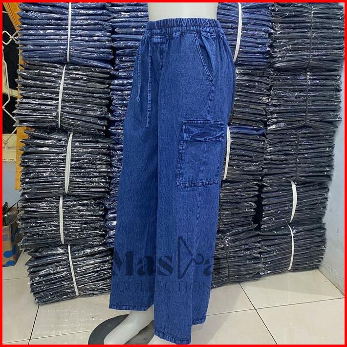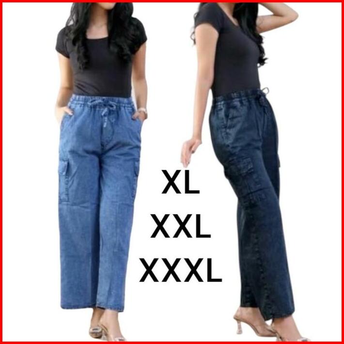 Celana Wanita Kulot Cargo Jeans Highwaist Jumbo Panjang Karet