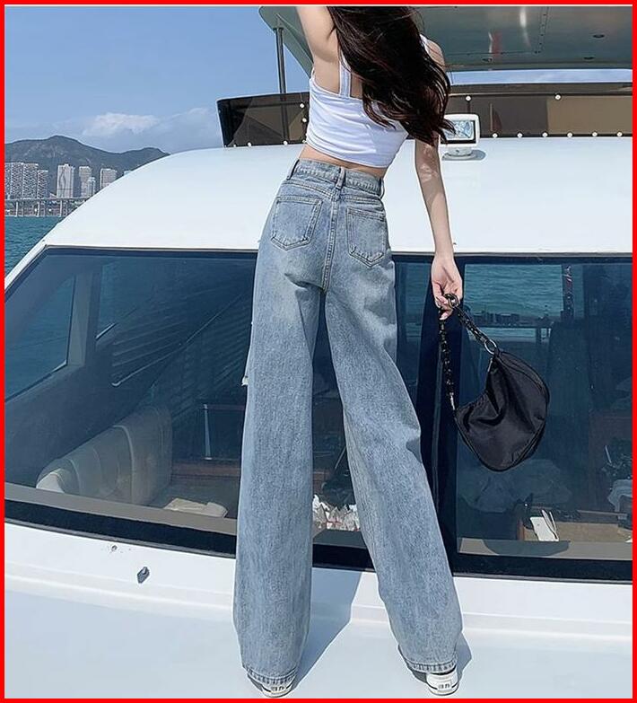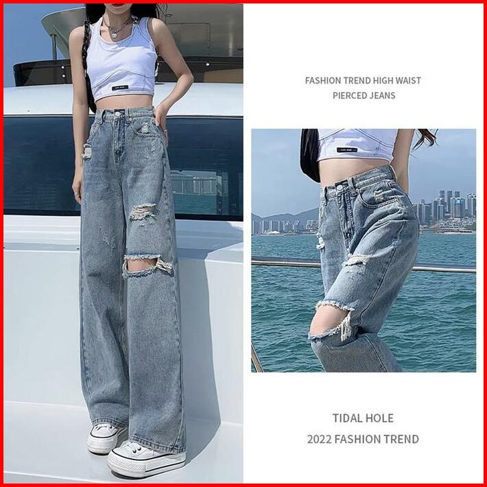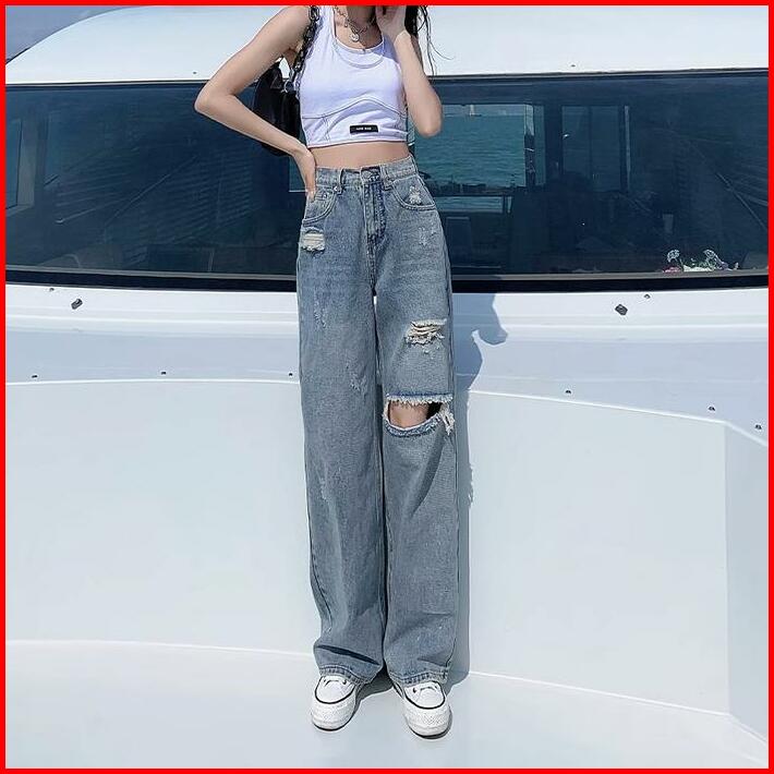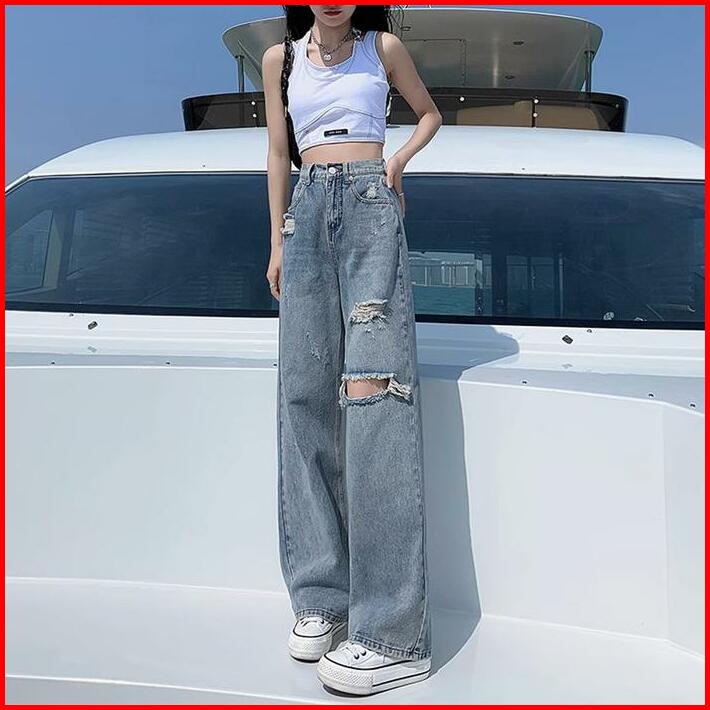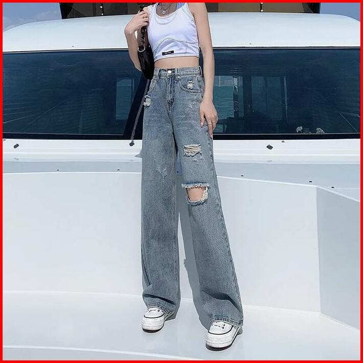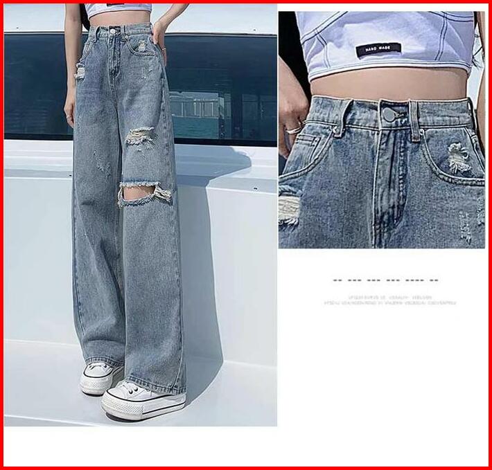 Celana Jeans Sobek Wanita Highwaist Kulot Jumbo Denim Cewek Jeans Panjang Cutbray Ripped Baggy Korean Style