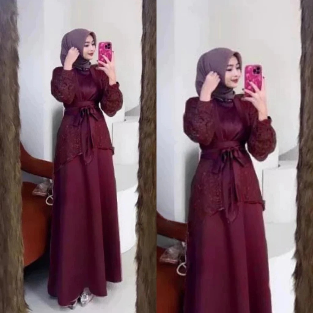 BurGUNDY - Veloxa Dress Lebaran 2025 Kondangan Inner Belt Outer M L XL XXL Premium Jumbo Mewah Gamis Muslim Satin BurGun