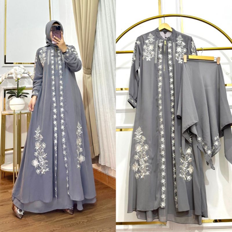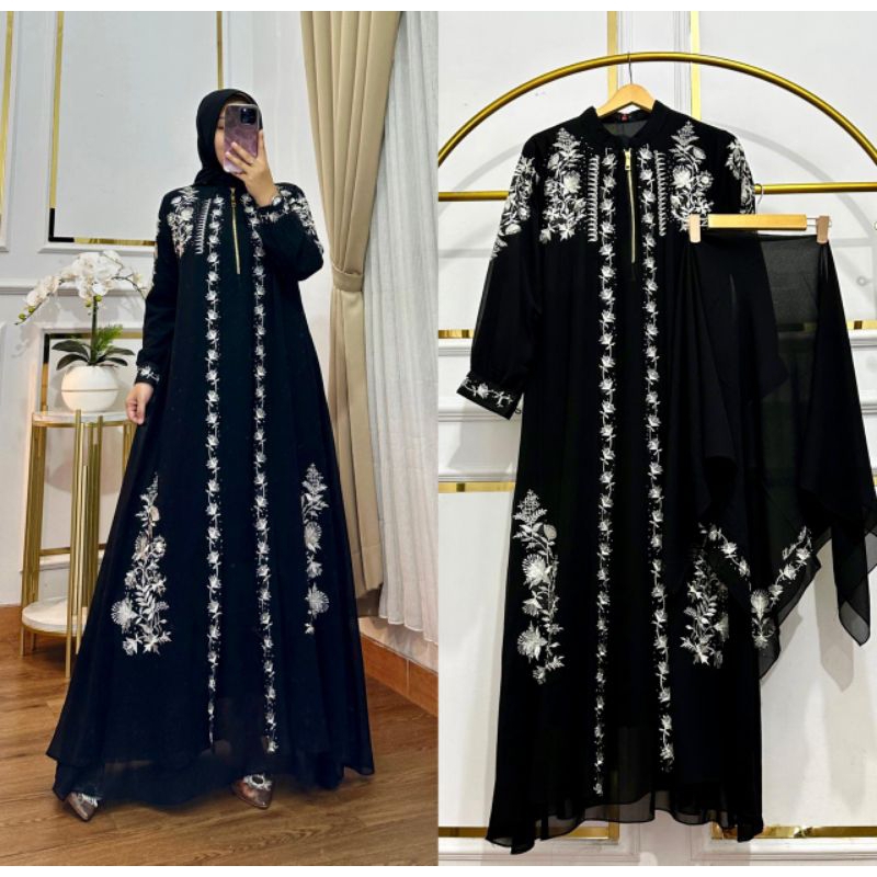 Gamis Bordir Set Hijab Terbaru bahan ceruty baby doll lebaran kekinian gamis kondangan terkini