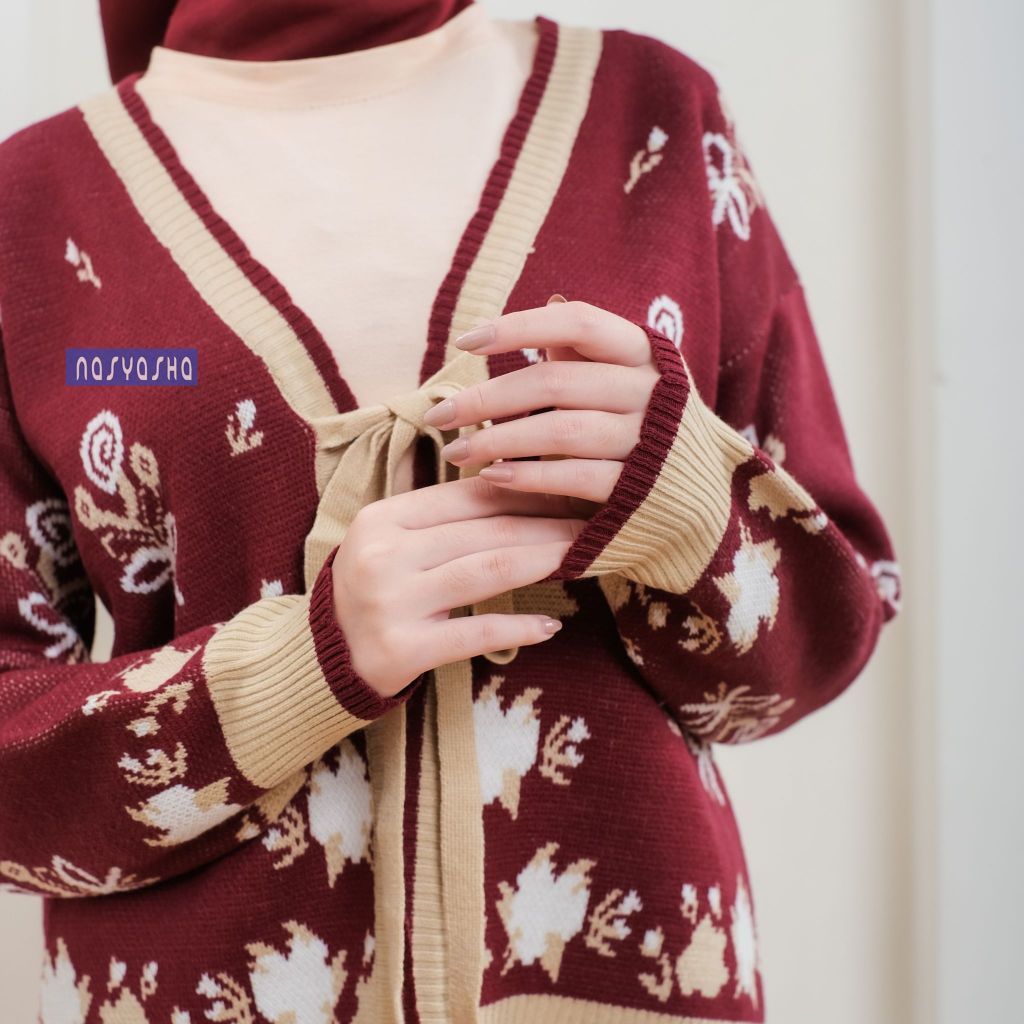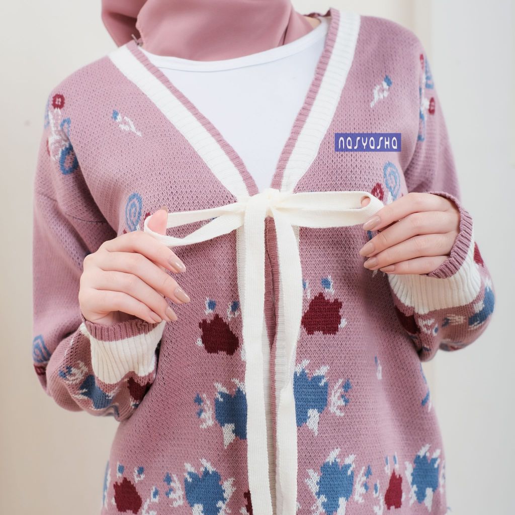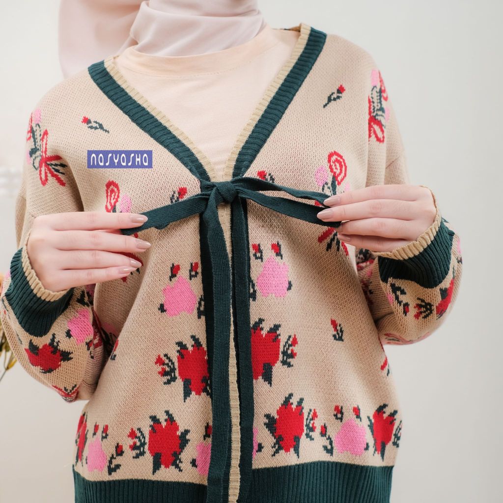 Nasyasha - Mosela Knitwear Outer Tali Pita - Cardigan Wanita Motif Bunga Bahan Rajut