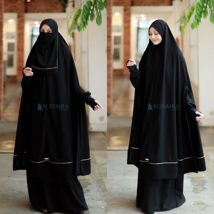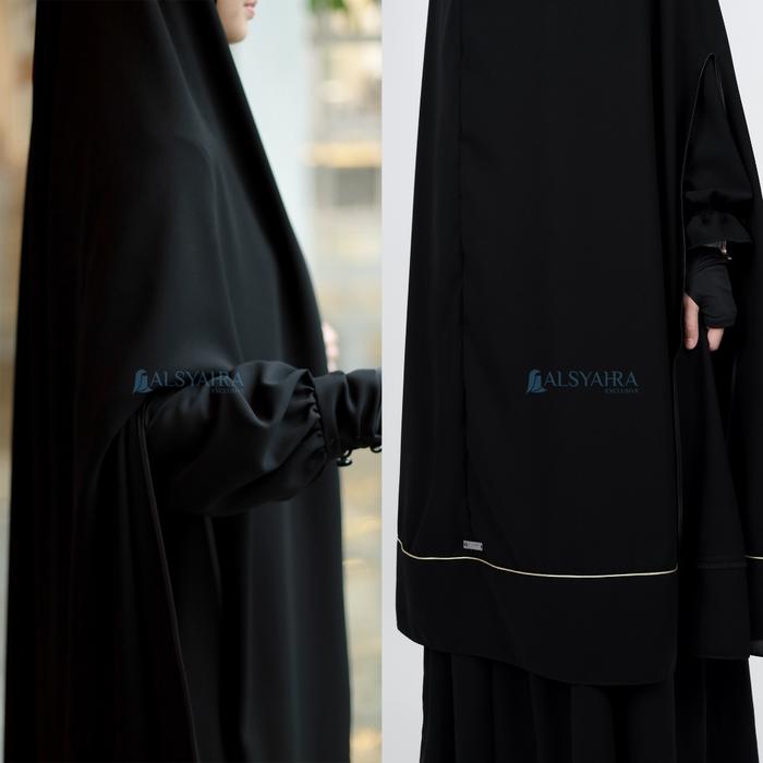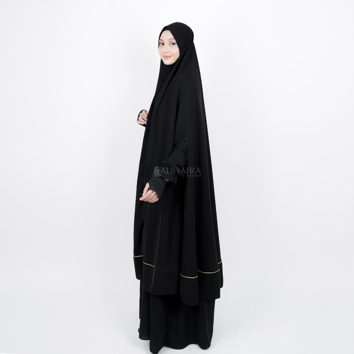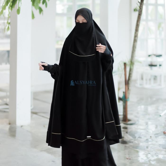 Alsyahra Exclusive Set Long Khimar Syari Handsplit List Gold Haramain Cadar Jetblack Muslim Panjang Jilbab Jumbo