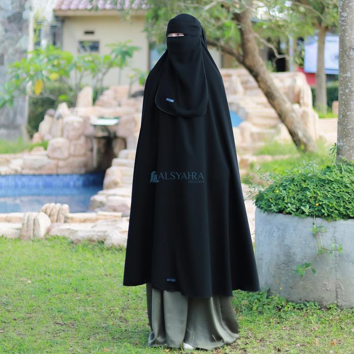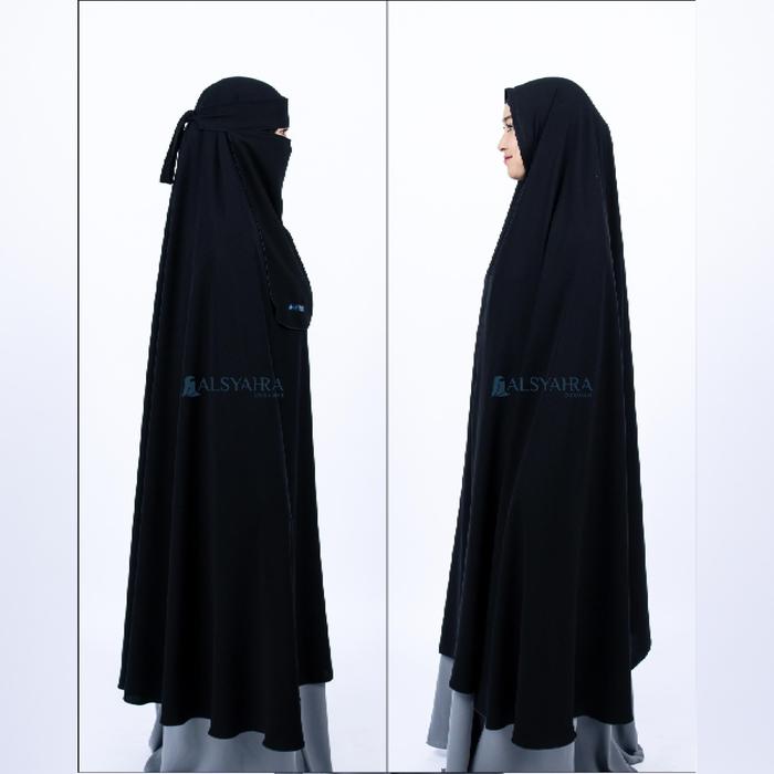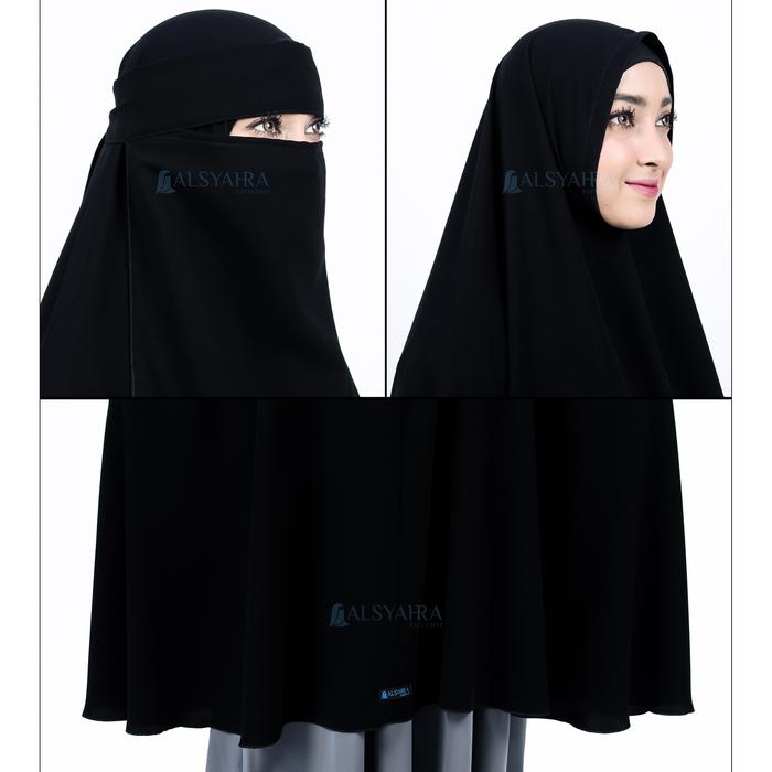 Set Khimar Syari Haramain Non Pet Niqab Bandana Jetblack Alsyahra Exclusive Long Hijab Jumbo Muslim Kerudung Instan