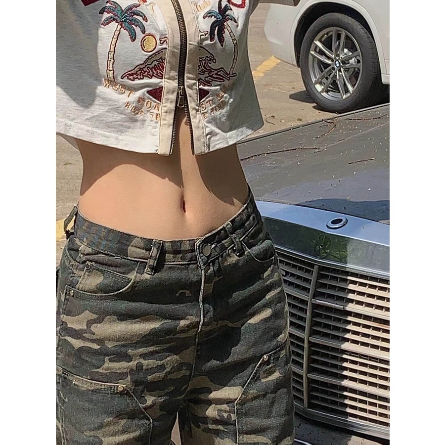 Celana Jeans Cargo Kamuflase Wanita Celana Lurus Longgar Berpinggang Tinggi Celana Kulot Wanita