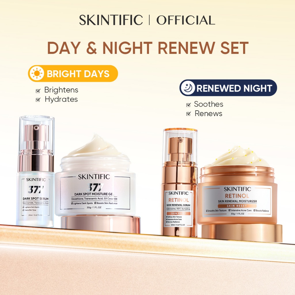 Skintific Paket Skincare Set 4PCS Day & Night Retinol Skin Renewal Serum 20ml dan Moisturizer