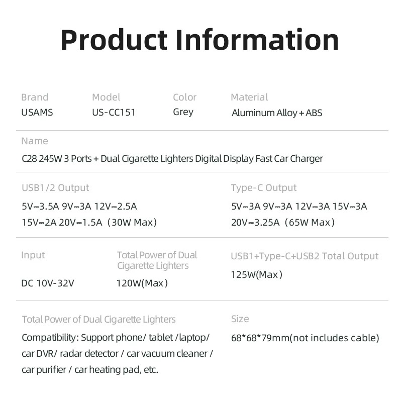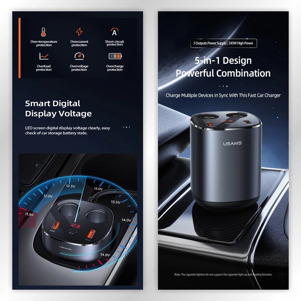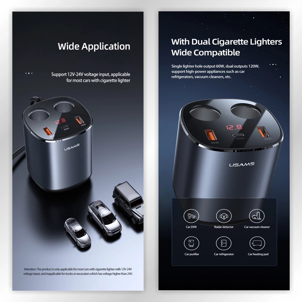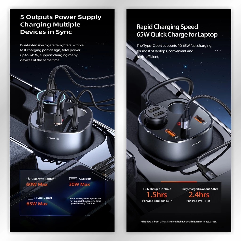 Charger Mobil Dual Cigarette Lighters Fast Car Charge USAMS C28 245W 5in1