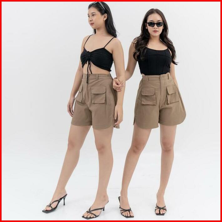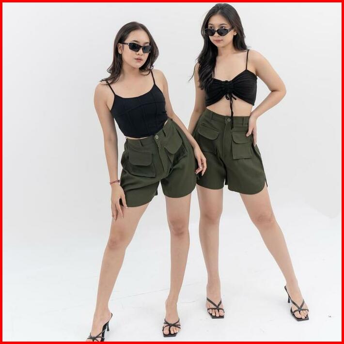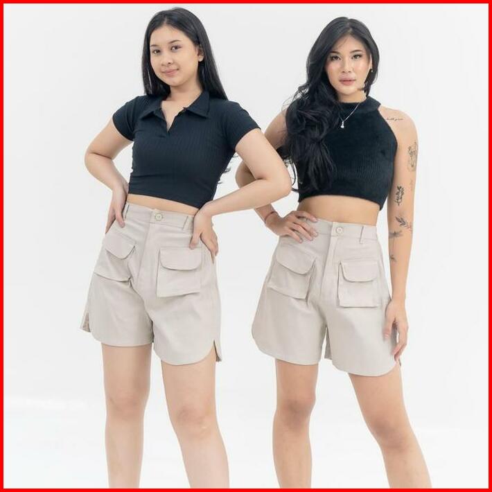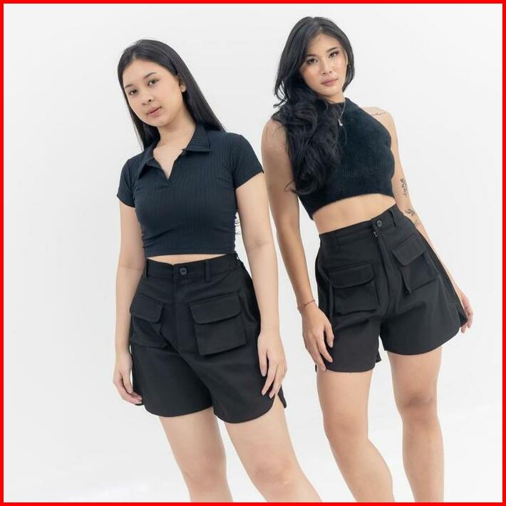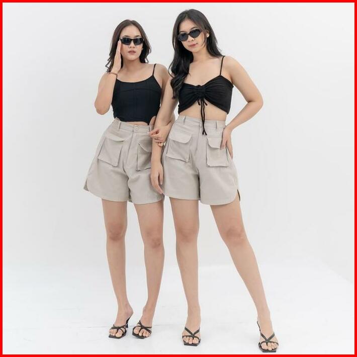 Celana Cargo Pendek Hotpants Wanita Pokka Pant Shortpants Highwaist Katun Santai Cewek Dewasa Hitam Celana Jumbo Yukacel