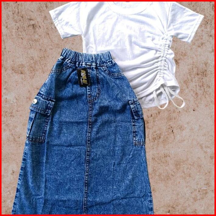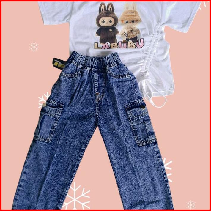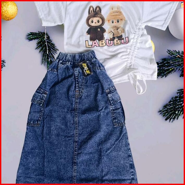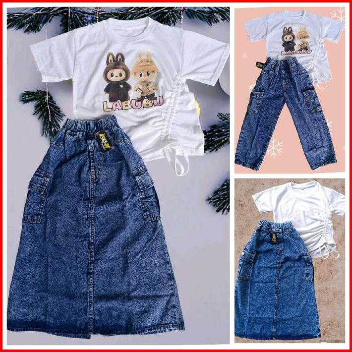 Setelam Labubu Rok Jeans Celana Cargo Fashion Anak Perempuan Usia 3--10 Th Setelan