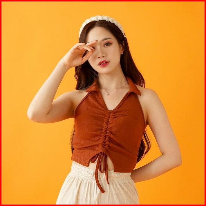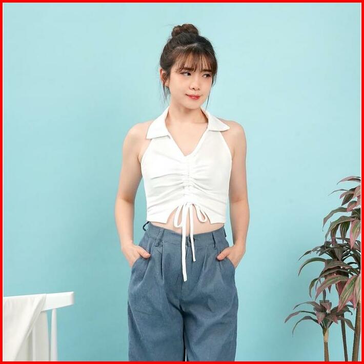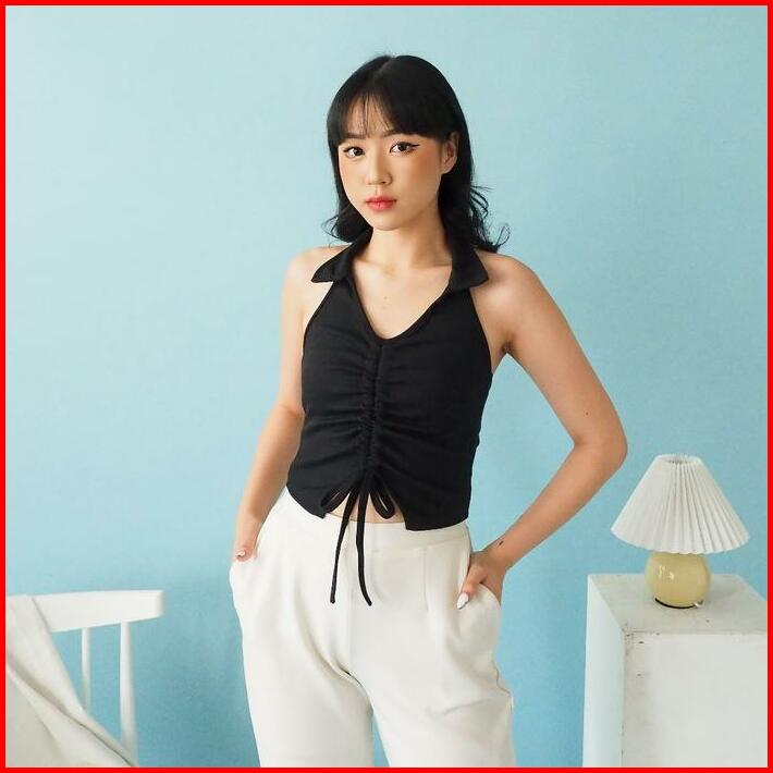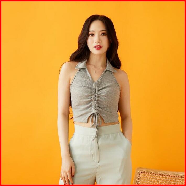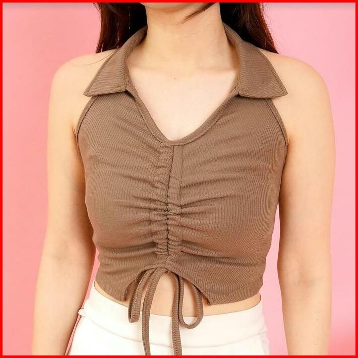 S To Xxl Kendra Halter V-neck Crop Tank Top Serut Rib Knit