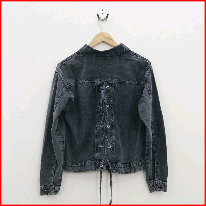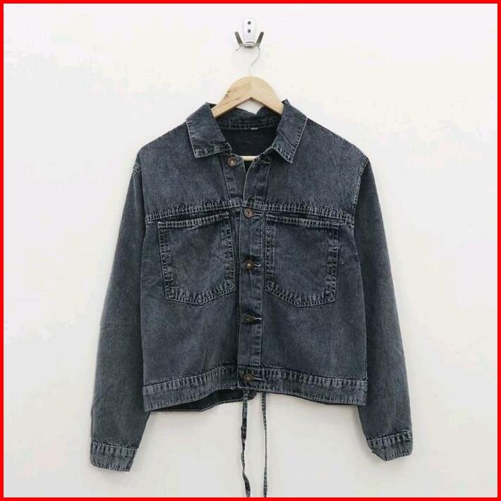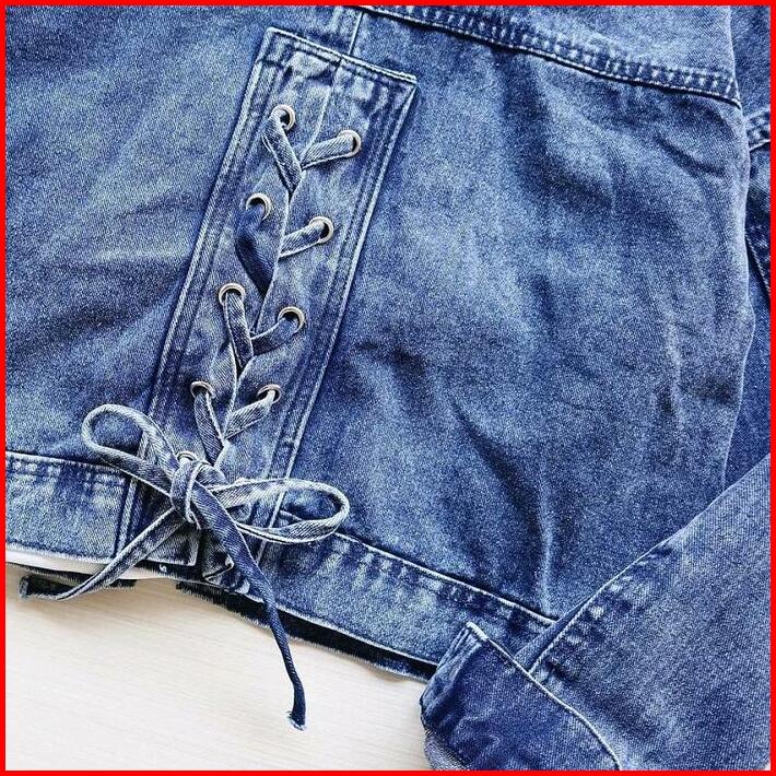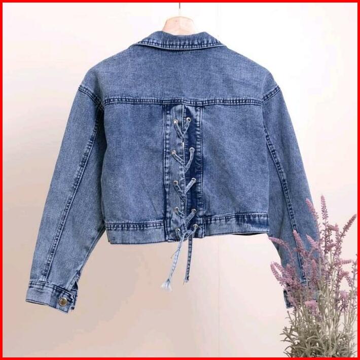 Jaket Crop Jeans Tali Belakang Polos Terbaru Lembut Tebal Oversize Keren
