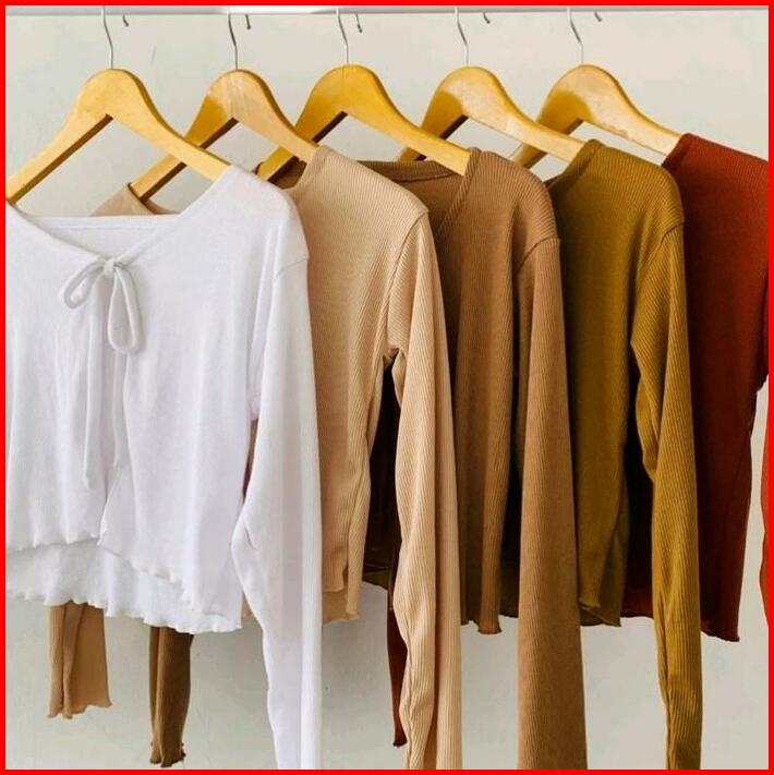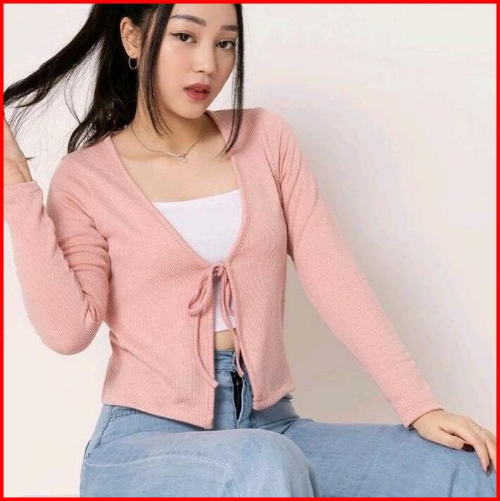 Cardigan Crop Rib Rajut Tali Polos Atasan Wanita Panjang Simple Nyaman Santai Knitwear Kardigan Outer Cardigan Butterfly